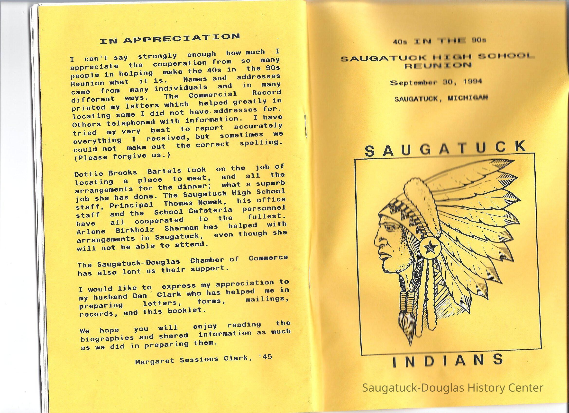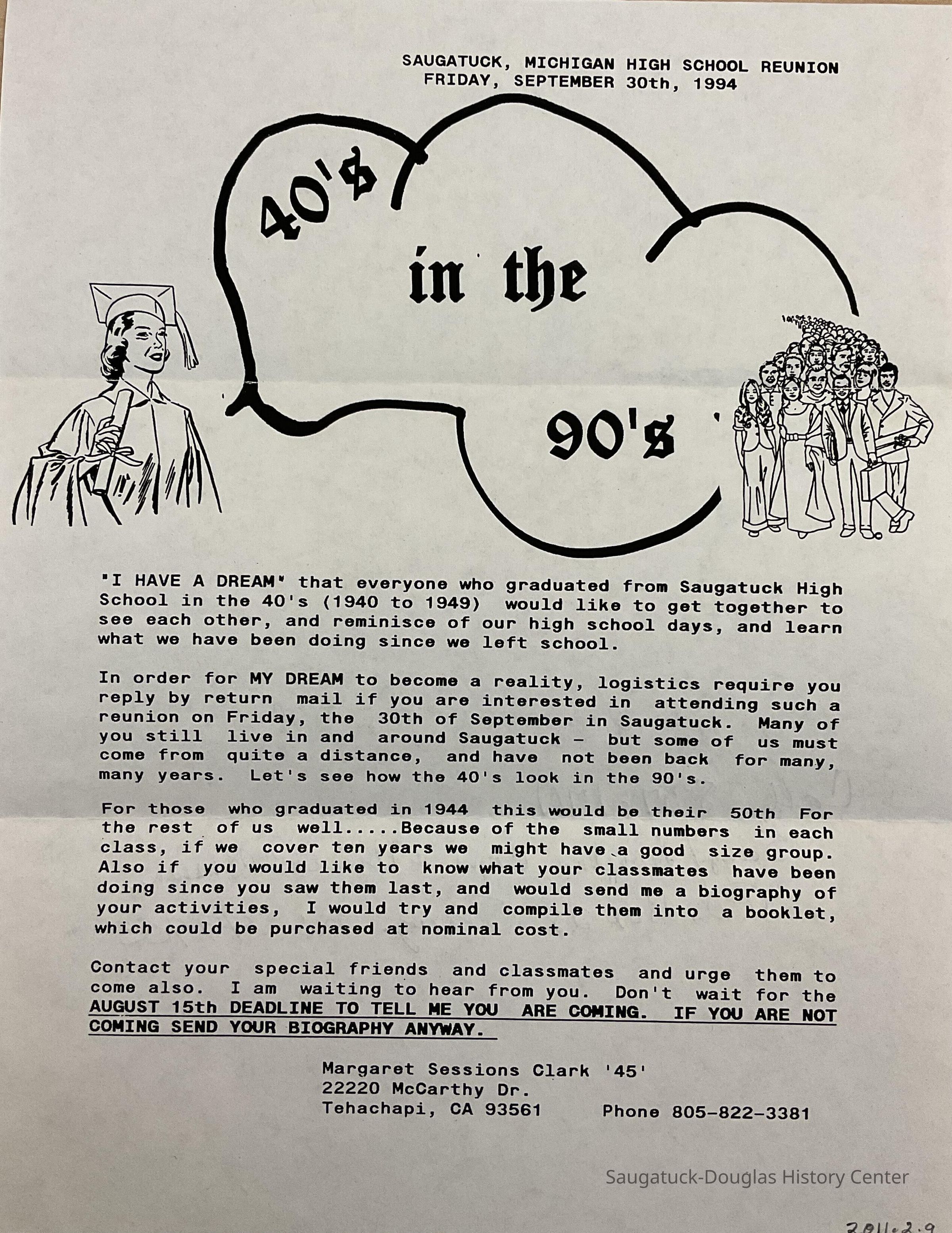 Invitation and booklet for the 40s in the 90s Saugatuck High School Reunion . Booklet lists the names and dates of graduates from from 1940-1949. Also included is a brief biography of some of the past students.