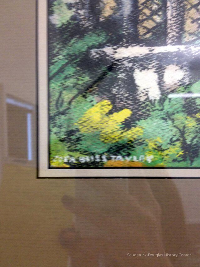 Cora Bliss Taylor, "All Saints' Church", no date - water color and gouache, matted and framed. Taylor depicts the All Saints' Saugatuck entrance tower. Here, she captures the charm of one of Michigan's finest Carpenter Gothic churches. The technique used here transforms the iconic Saugatuck church into an arrangement of abstract patterns and shapes. The angularity and color thrust the eye upward toward "heaven."
