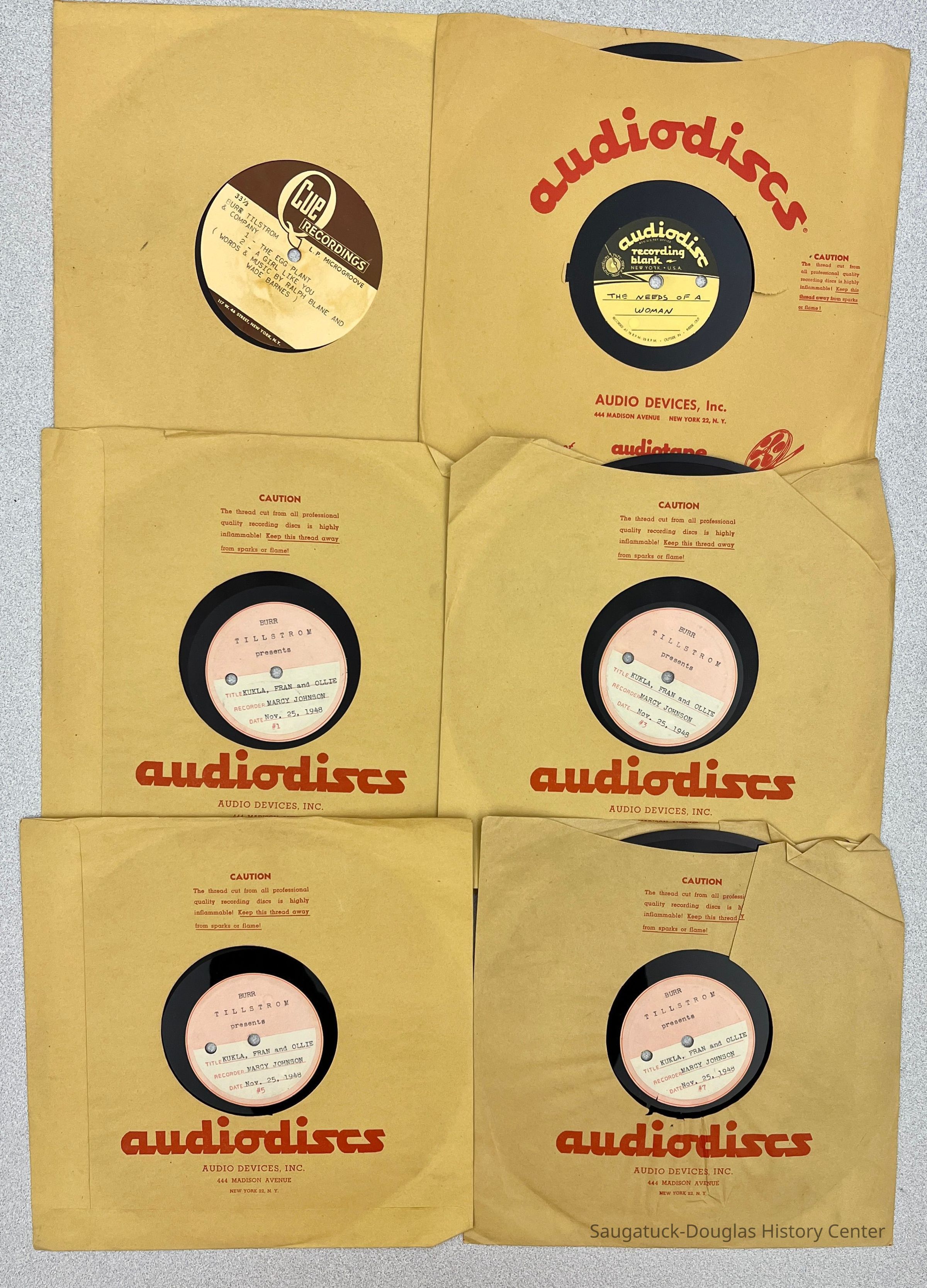 Six 10-inch 33rpm Burr Tillstrom audio recordings in brown-paper sleeves. Records are bundled in a blank cardboard folder. a. Burr Tilstrom [sic] & Company, The Egg Plant, A Girl Like You (Words and Music by Ralph Blane and Wade Barns), Side 2 is blank. Cue Recordings. b. The Needs of a Woman. Side 2 is blank. Audiodisc Audio Devices. c.-f. (4 records) Burr Tillstrom presents Kukla, Fran and Ollie, recorder Marcy Johnson, Nov. 25, 1948 #1-#7. Side of two of last record (side #8) is blank.