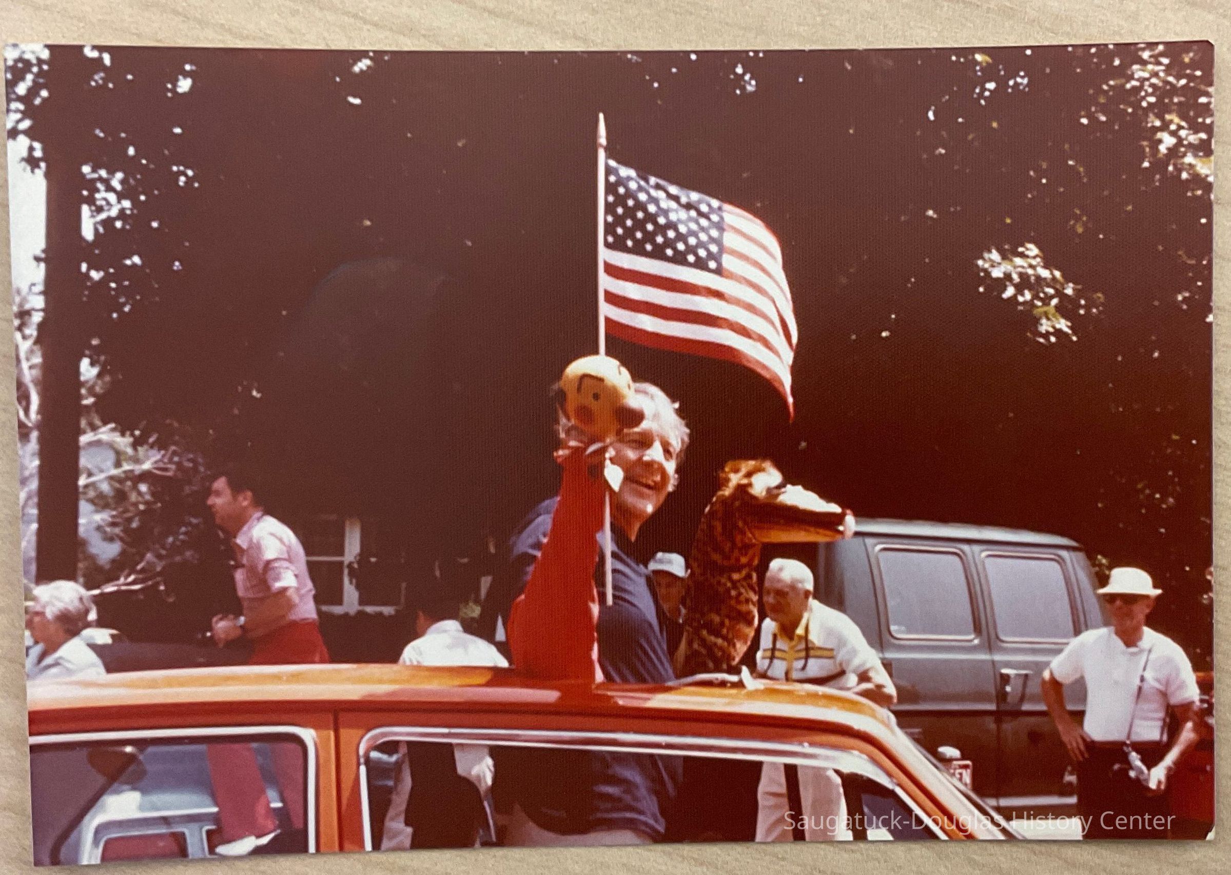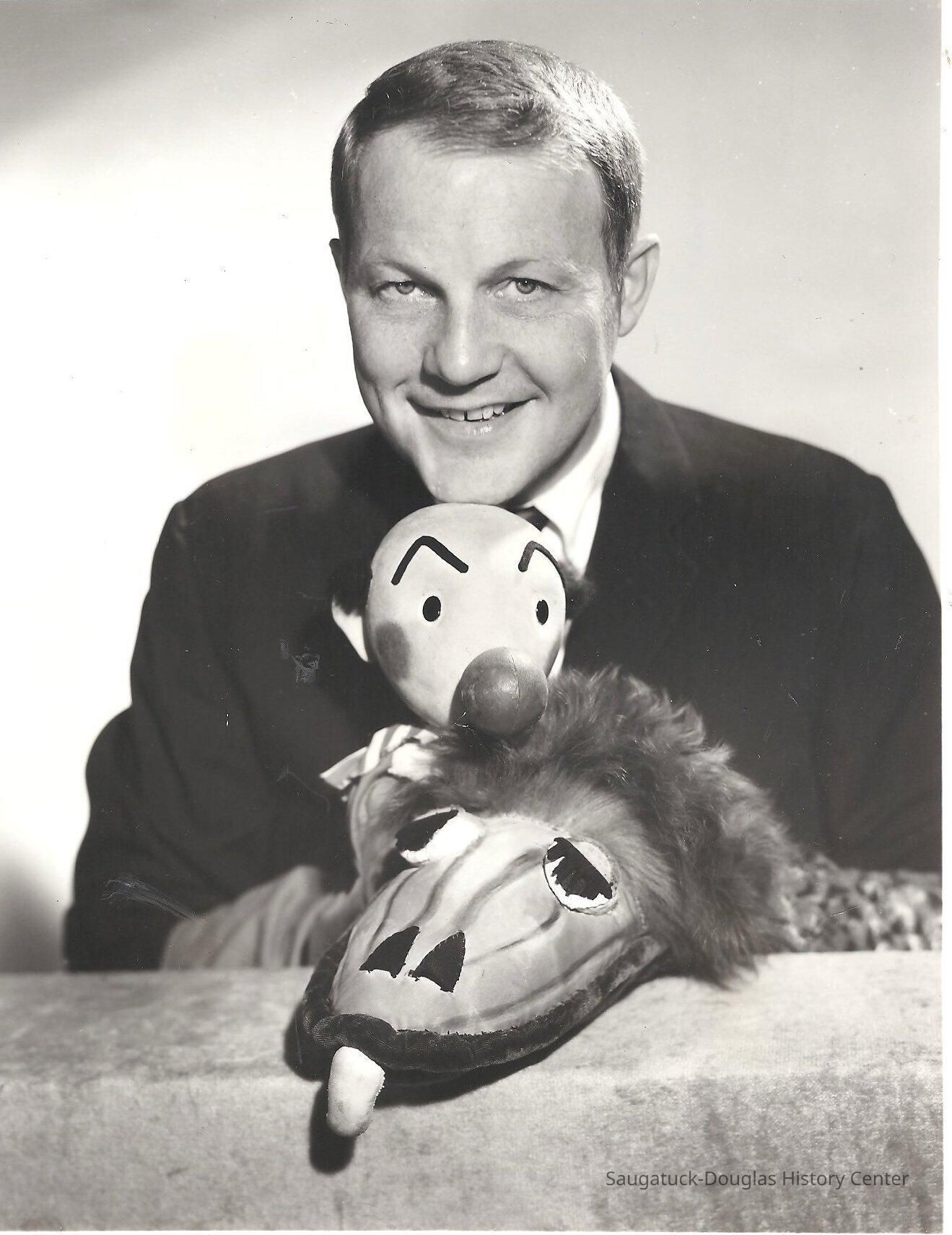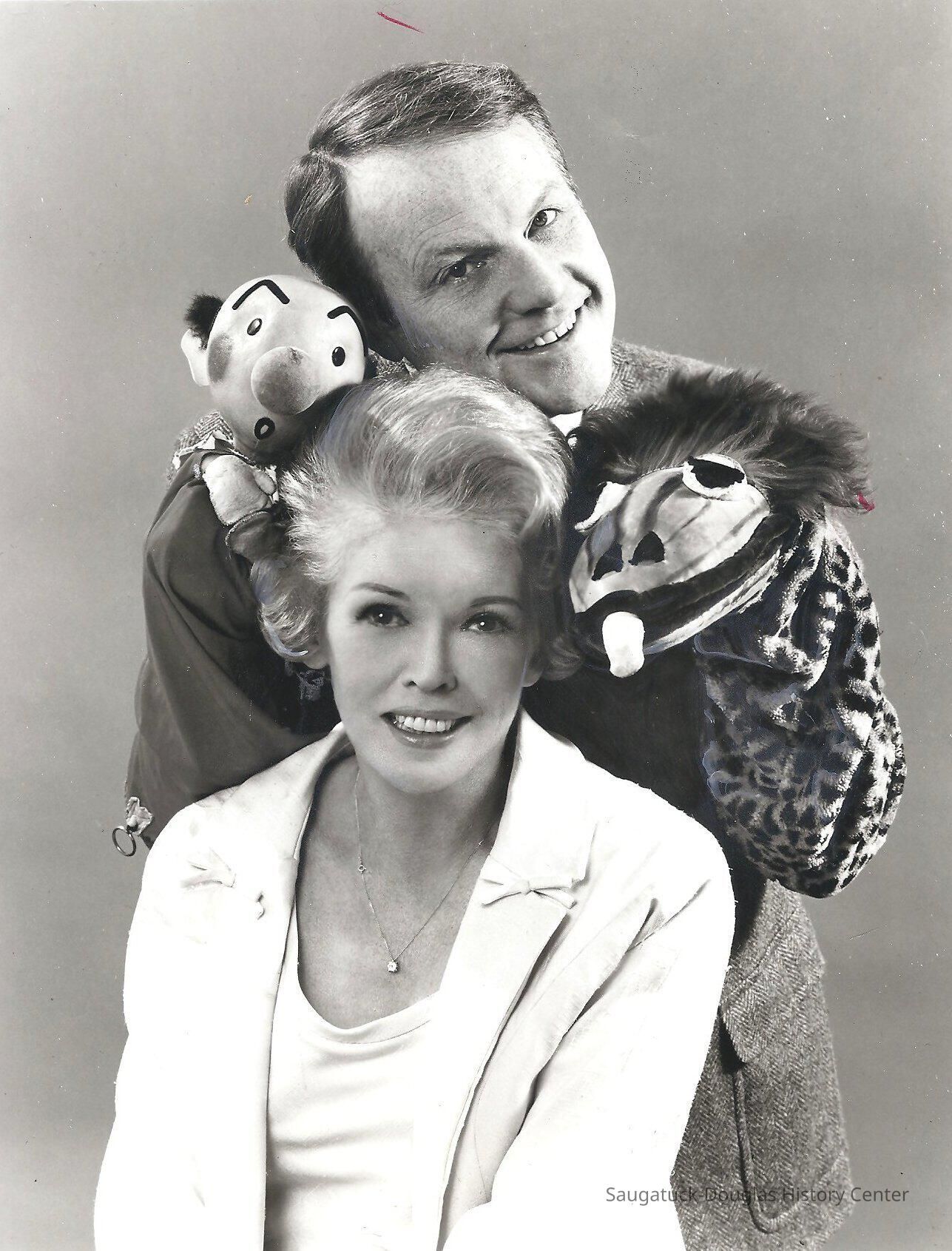 Two 8x10" black and white studio photographs of Burr Tillstrom. One of him alone with Kukla and Ollie and one of Burr with Fran Allison and the puppets. Note on the back says, 'Program on Air Thursday, November 28, 9 a.m. - 12 noon EST. CBS Television. Also includes a photo of Burr, Kukla and Ollie standing up in a car in what looks to be a parade; probably July 4, 1976 based on the date the photo was printed.