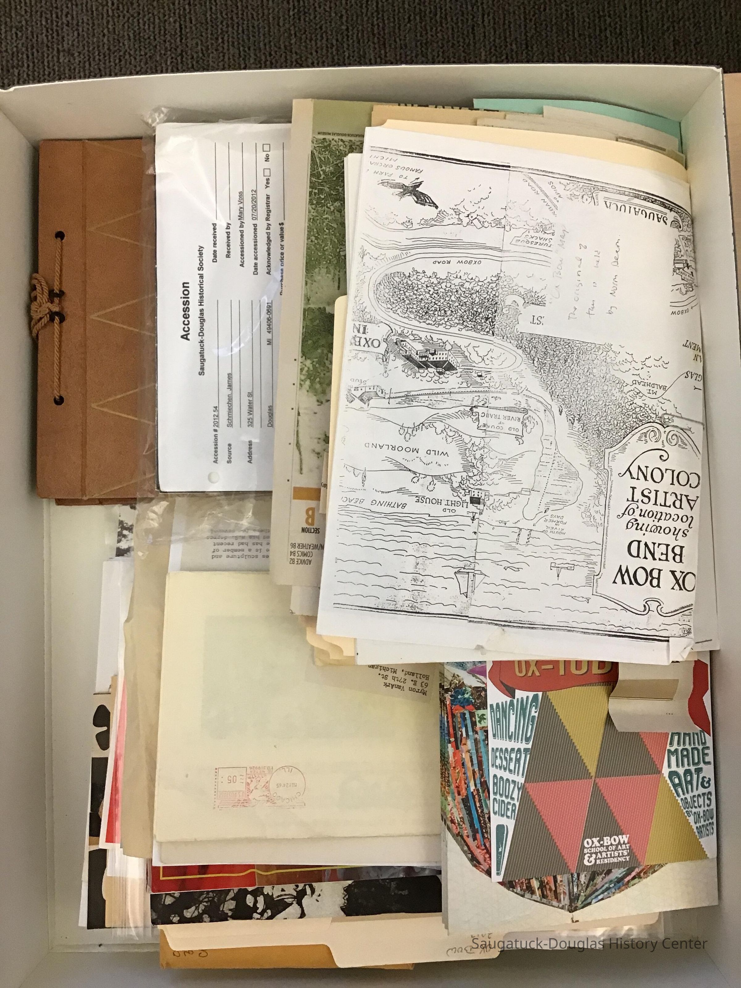5 black and white Photos of buildings, including the Riverside Inn and the White House caretaker’s cottage. Scan of several advertisements, including for summer classes at Ox Bow. A Schedule of Ox Bow’s 1965 Summer classes with descriptions of the teachers and their credentials. Card from the Ox Bow Winter Benefit Auction, 2006. Card from the Ox Bow Winter Benefit Auction, 2005. Card with a list of Ox Bow’s Friday Night Open Studios. Mailer for the Ox Bow Summer Painting School 1965. Display Letter describing various events in Saugatuck, including Venetian Night and performances by Burr Tillstrom. Print of a map of “Ox Bow Bend showing location of Artist Colony”. There is also a scan of this item. A page from a Magazine with an article about the 1909 Summer School of Painting. An envelope with a Note and a Floppy Disc with a 2001 historical presentation about Ox Bow. 2 Programs with a Map from the Ox Bow 75th Anniversary. Mailer card for the 1963 Summer School of Painting. Mailer for the 1967 Summer School of Painting. Program for the 2006 Ox Bow Winter Benefit Auction. Invitation for the Ox Bow 75th Anniversary. 2 Posters for the 1991 Ox Bow Open House. Print of a hand-drawn Map of Ox Bow. Invitation to the 1998 Ox Bow Summer Benefit Auction. Postcard with a photo of Ox Bow. Card from the member’s preview of the “A Place Called Ox Bow” exhibit at the SDHS History Museum. A Project Description for a proposed study of the Art Colony at Ox Bow. Poster for the 1955 Midsummer Madness Arts Ball. Brochure of 2003 Ox Bow programs. Program from the 2001 Summer Benefit Auction. Program from the 2002 Summer Benefit Auction. Program from the 2003 Winter Benefit Auction. Biography for Vinnorma Shaw MaKenzie. Invitation for the 2005 Auxiliary Board of the School of the Art Institute of Chicago Gala. Card for Ox Bow Friday Night Open Studios. Card for 2015 Summer sessions at Ox Bow. Program for 2015 Summer classes. Card for community events and programs at Ox Bow for summer 2010. Bookmark for the “A Place Called Ox Bow” exhibit. A Letter inviting the recipient to become a Friend of Ox Bow with a card for the 1982 Opening Reception. A black and white Photo of a man sitting at a campfire. The caption on the back identifies him as John Peterson. Invitation to the 1999 Ox Bow Summer Benefit Auction. A black and white Photo of several people painting en plein air. A Scan of an article from the Michigan Historical Review, “Summers at Ox-Bow: The Early Days of a Michigan Art Colony”.