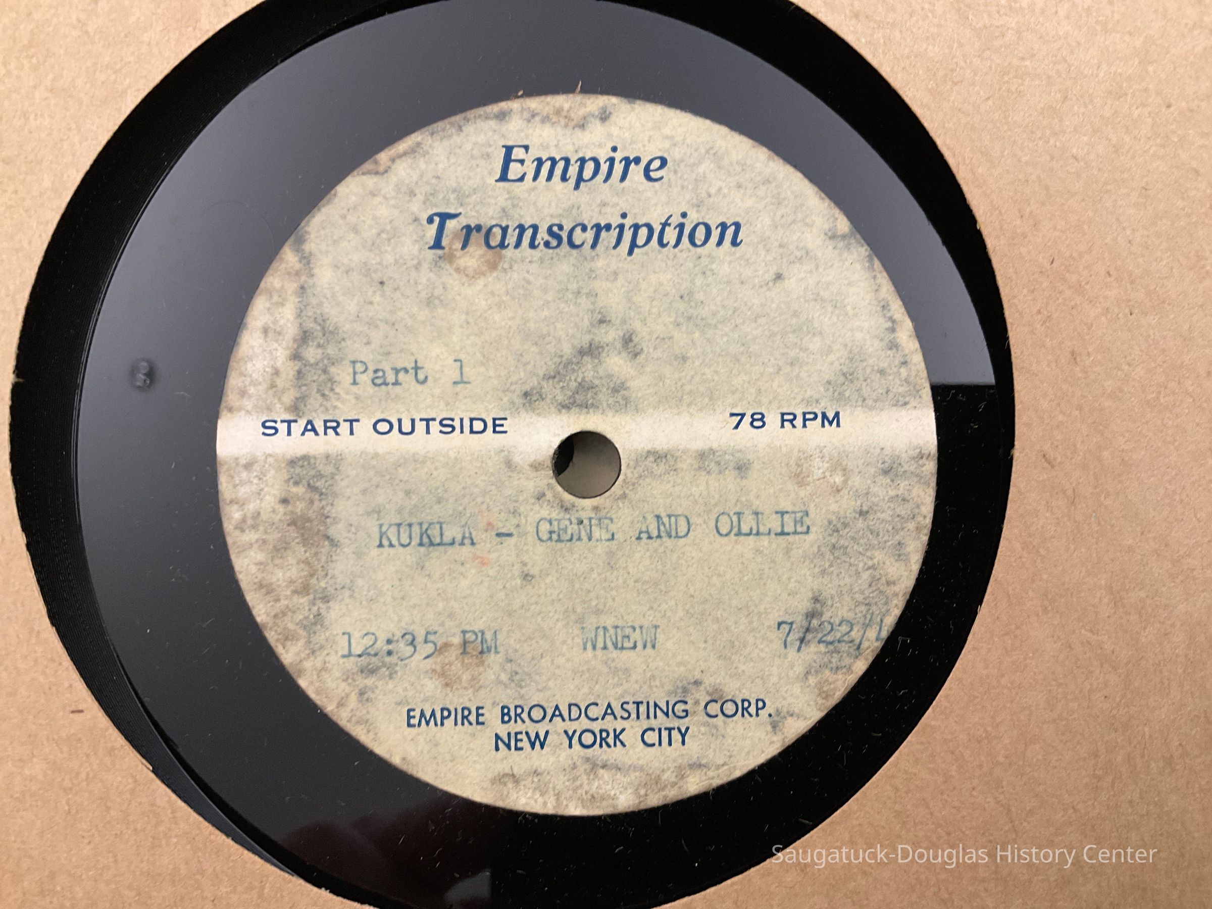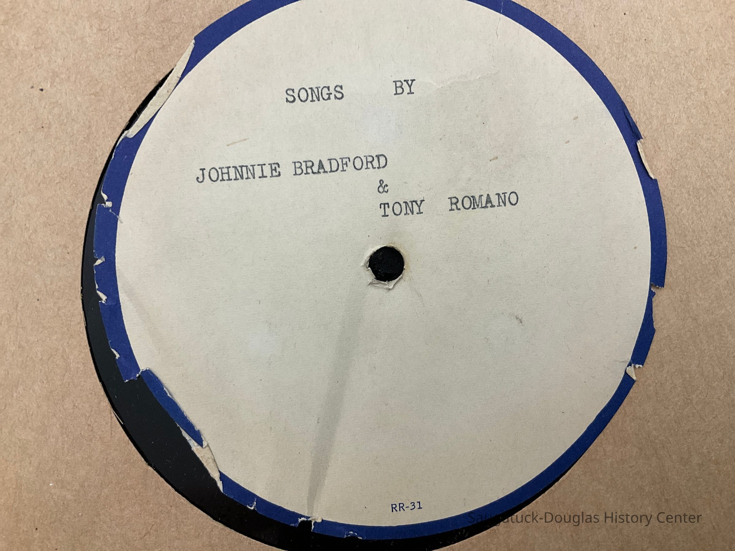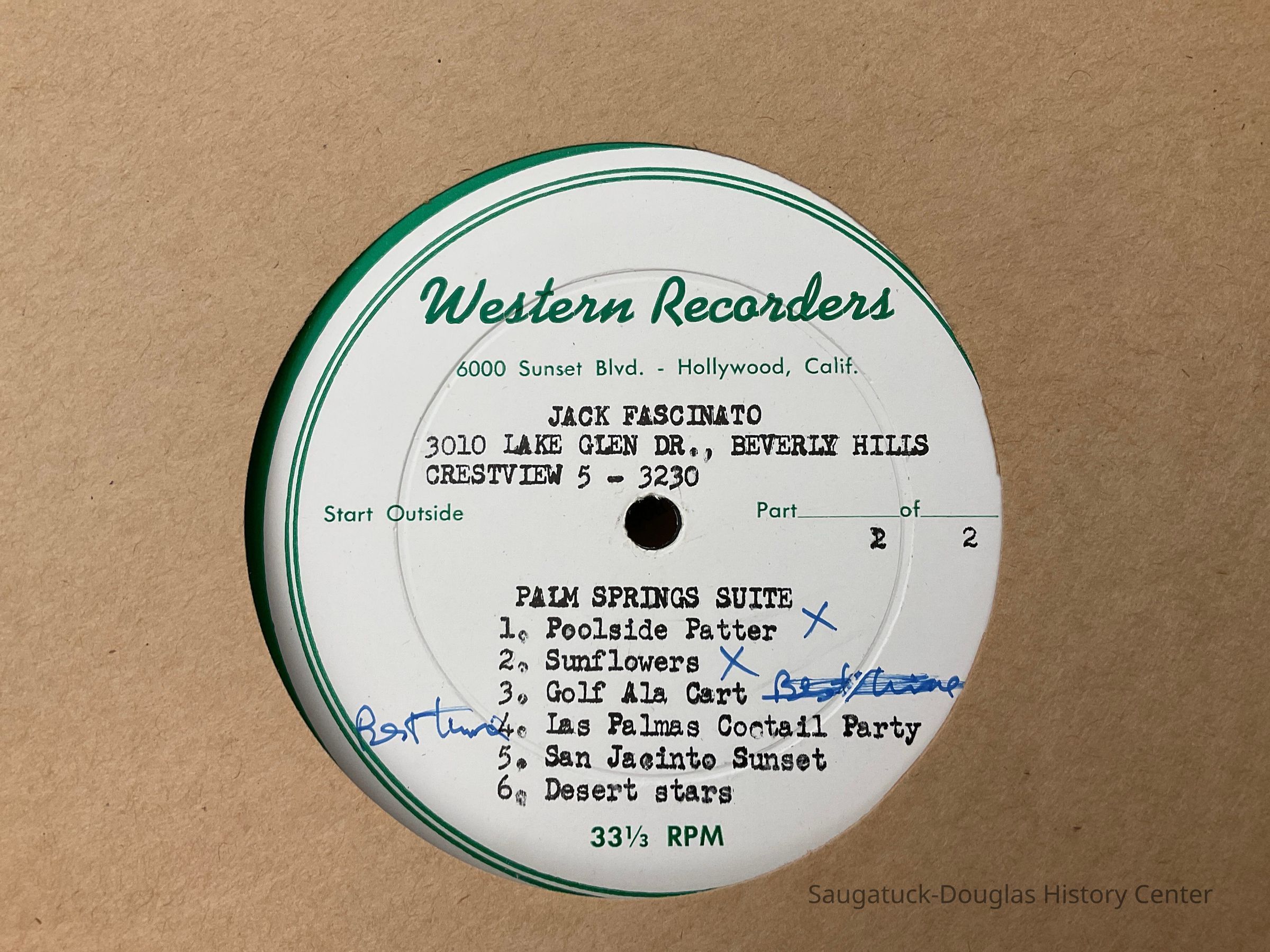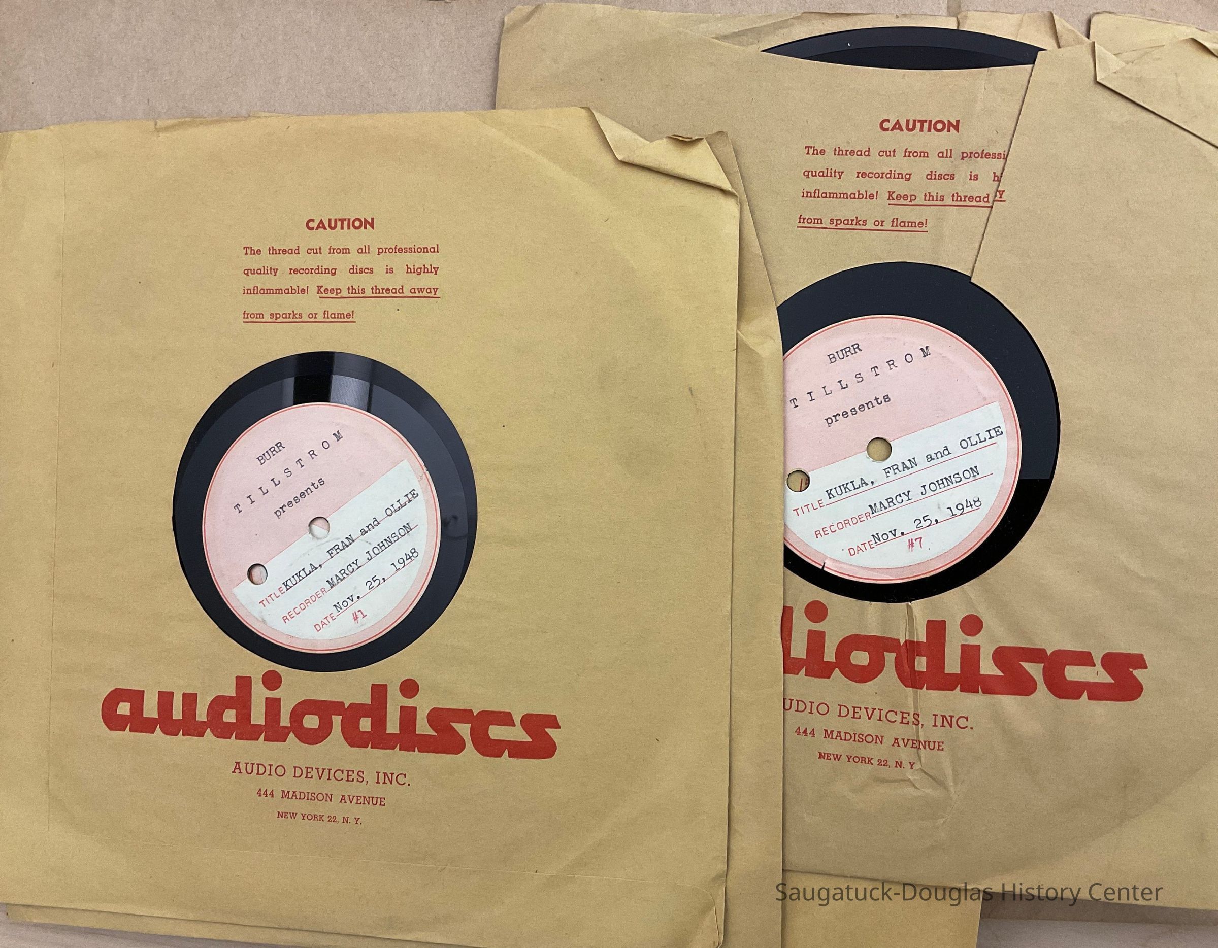 Album #1 of 3 albums containing audio recordings of various performances. Mostly Kukla, Fran & Ollie Album #1 also contains a “dub” (typed 2-page document) of the Palm Springs Suite. .a - Disk - RCA, Speed 78 DRAGON RETREAT - Kukla, Fran and Ollie TAKE A LOOK AT ME KUKLA, FRAN AND O’LEE - Kukla, Fran and Ollie .b - Disk - NBC Reference Recording INSTANTANEOUS, Speed 78 “MRS OGG” Copied from KFO PGM of SEPT 13/53. Includes hand written: “Happy Birthday From Ed & M” .c - Disk- United Film and Recording Studios, Speed 33.3 NORMAN ROSS SHOW (“Burr Tilstrom”) .d - Two typed pages describing PALM SPRINGS SUITE by Jack Fascinato This includes a hand written note: “Burr Boy - Here is a rough “dub”on the suite - won’t be released until ‘59. Working on a couple of more that will be better but wanted you to heard this - Best regards, Jack” .e - Disk - Western Recorders, speed 33 1/3 PALM SPRINGS SUITE - Jack Fascinato Side 1 Desert Dawn Sunrise Way Breakfast at Ride Tahquitz Canyon The Tally HoPalm Canyon Drive Side 2 Poolside Patter Sunflowers Golf Ala Cart Las Palmas Coctail Party San Jacinto Sunset Desert stars .f - Disk - Empire Transcription, Speed 33 1/3 RPM, 12:35 PM WNEW 7/22/49 KUKLA - GENE AND OLLIE (1/2) .g - Disk - KUKLA - GENE AND OLLIE (2/2) .h - Disk - RCA De Luxe Recording World’s Fair Gang - Tillstrom’s Visit .I - Disk - SONGS BY JOHNNIE BRADFORD & TONY ROMANO