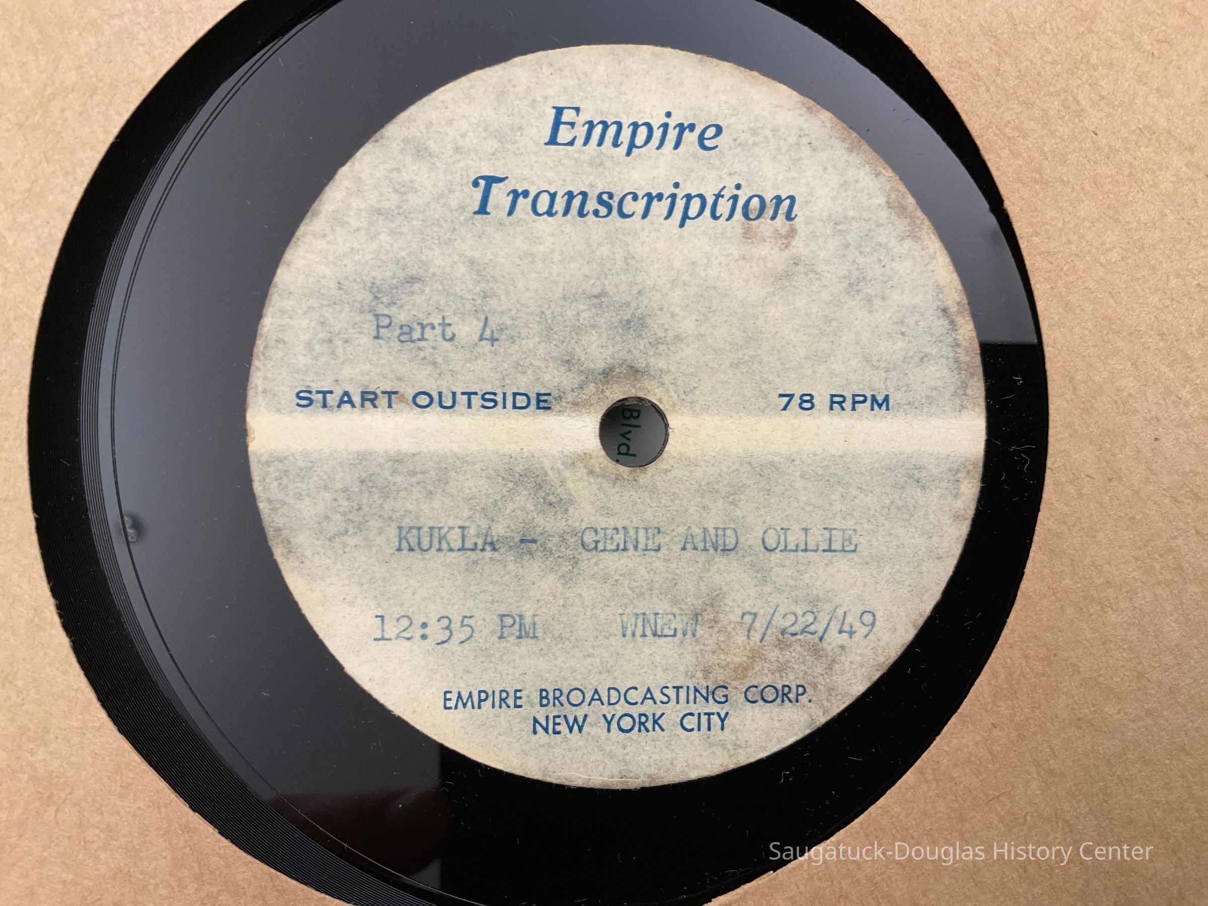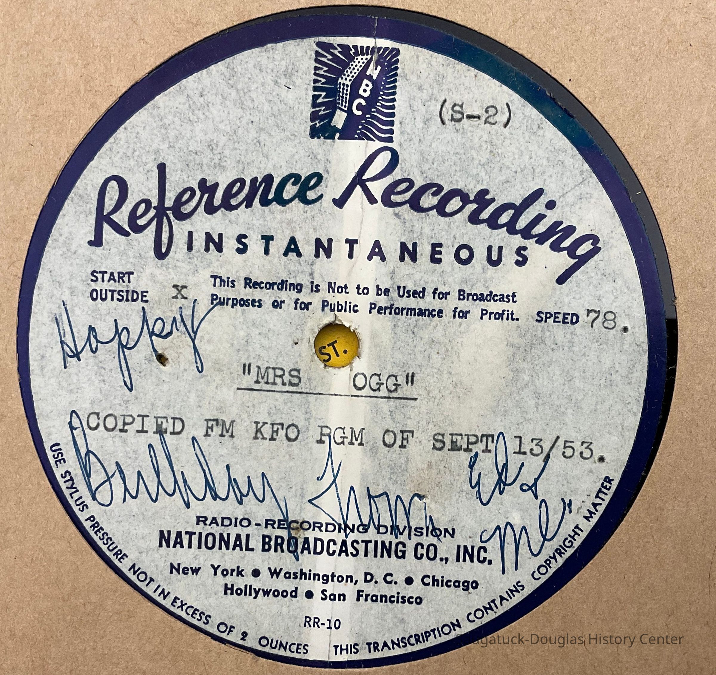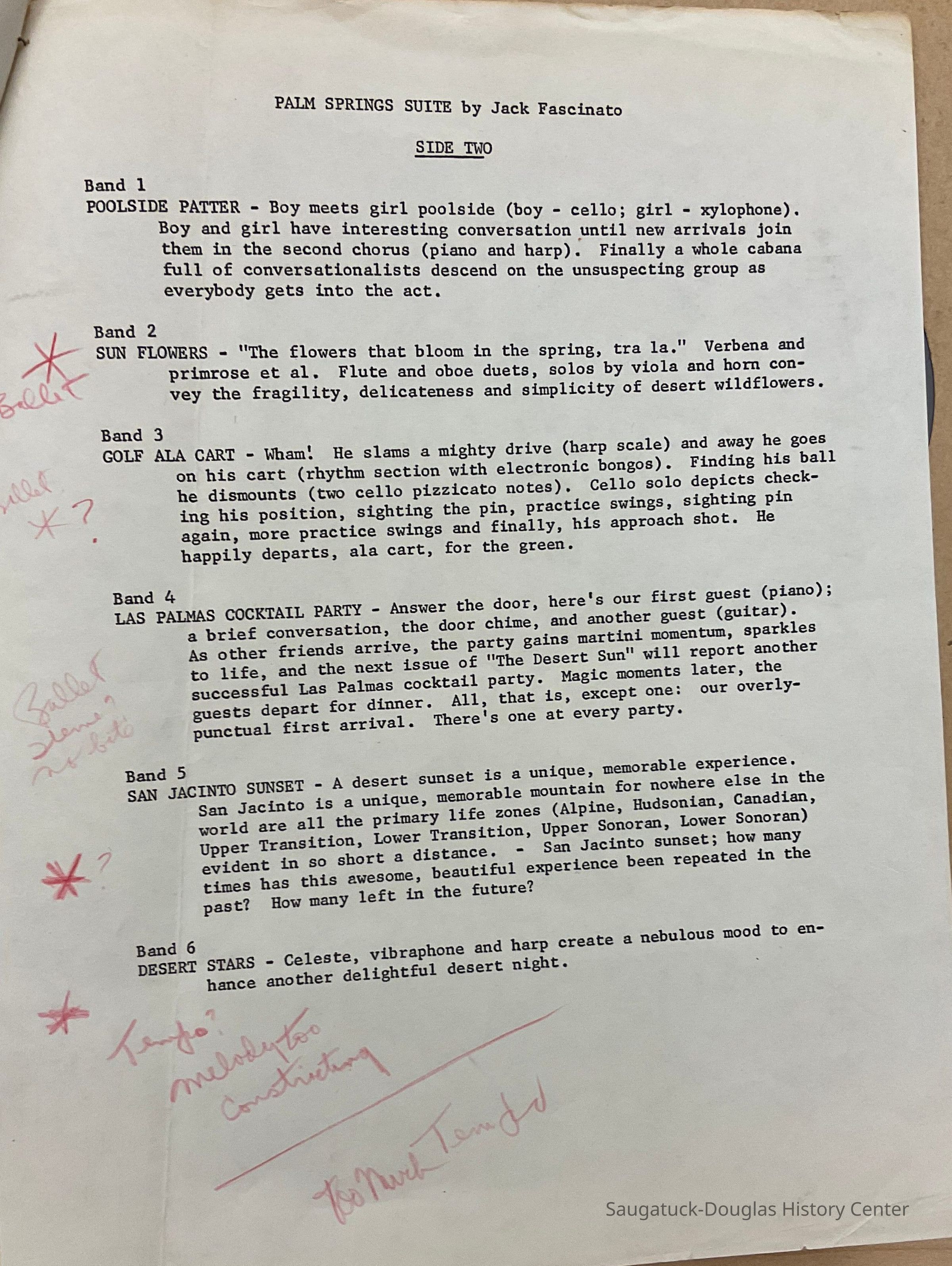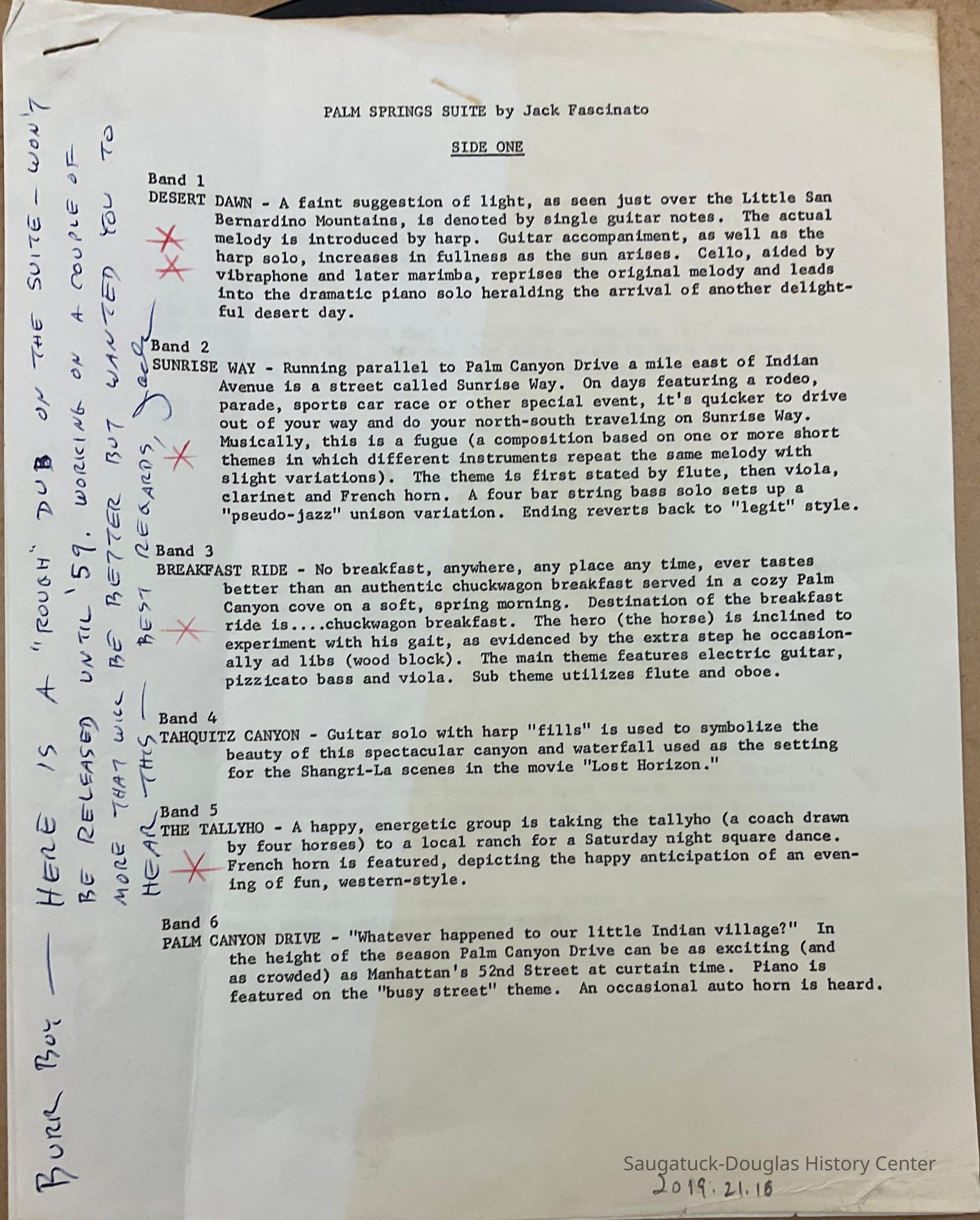 Album #1 of 3 albums containing audio recordings of various performances. Mostly Kukla, Fran & Ollie Album #1 also contains a “dub” (typed 2-page document) of the Palm Springs Suite. .a - Disk - RCA, Speed 78 DRAGON RETREAT - Kukla, Fran and Ollie TAKE A LOOK AT ME KUKLA, FRAN AND O’LEE - Kukla, Fran and Ollie .b - Disk - NBC Reference Recording INSTANTANEOUS, Speed 78 “MRS OGG” Copied from KFO PGM of SEPT 13/53. Includes hand written: “Happy Birthday From Ed & M” .c - Disk- United Film and Recording Studios, Speed 33.3 NORMAN ROSS SHOW (“Burr Tilstrom”) .d - Two typed pages describing PALM SPRINGS SUITE by Jack Fascinato This includes a hand written note: “Burr Boy - Here is a rough “dub”on the suite - won’t be released until ‘59. Working on a couple of more that will be better but wanted you to heard this - Best regards, Jack” .e - Disk - Western Recorders, speed 33 1/3 PALM SPRINGS SUITE - Jack Fascinato Side 1 Desert Dawn Sunrise Way Breakfast at Ride Tahquitz Canyon The Tally HoPalm Canyon Drive Side 2 Poolside Patter Sunflowers Golf Ala Cart Las Palmas Coctail Party San Jacinto Sunset Desert stars .f - Disk - Empire Transcription, Speed 33 1/3 RPM, 12:35 PM WNEW 7/22/49 KUKLA - GENE AND OLLIE (1/2) .g - Disk - KUKLA - GENE AND OLLIE (2/2) .h - Disk - RCA De Luxe Recording World’s Fair Gang - Tillstrom’s Visit .I - Disk - SONGS BY JOHNNIE BRADFORD & TONY ROMANO