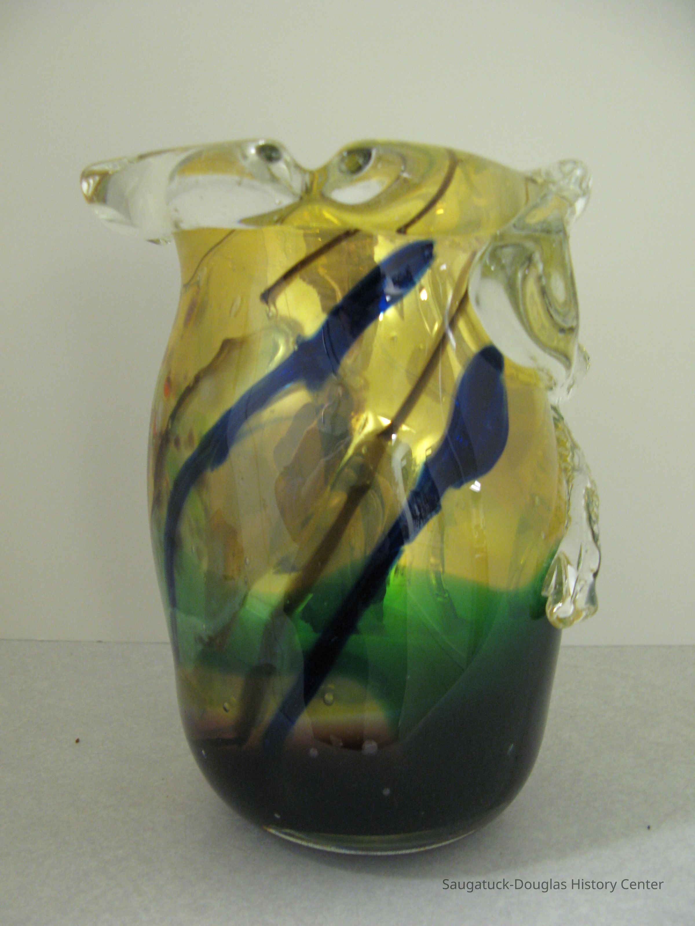 4.5" x 7" green, black and yellow glass vase with embossed dragonfly. Made at Ox-Bow by Jerry Catania as a gift to Jean Palmer in 1987. (signed J Catania)