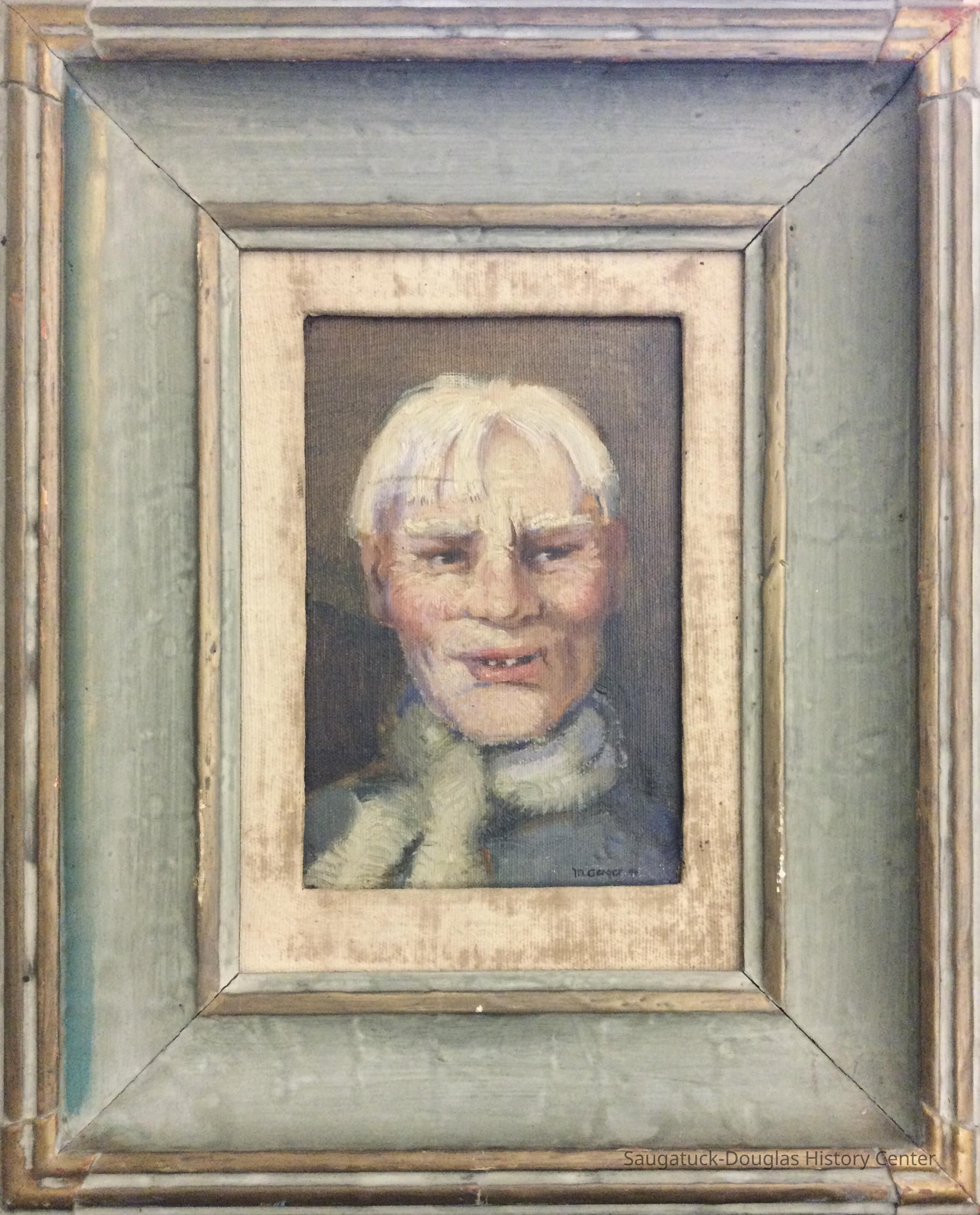 Oil painting of an unknown man, a friend of the artist Max Gerger. The subject has white hair, thick eye brows, rosy cheeks, and is wearing a fuzzy scarf. Gerger used to hang out at the docks in Saugatuck and chat with the boatmen and their families, where he painted this. Framed in an original wood frame painted a light green with gold accents. The inner mat is a beige canvas.