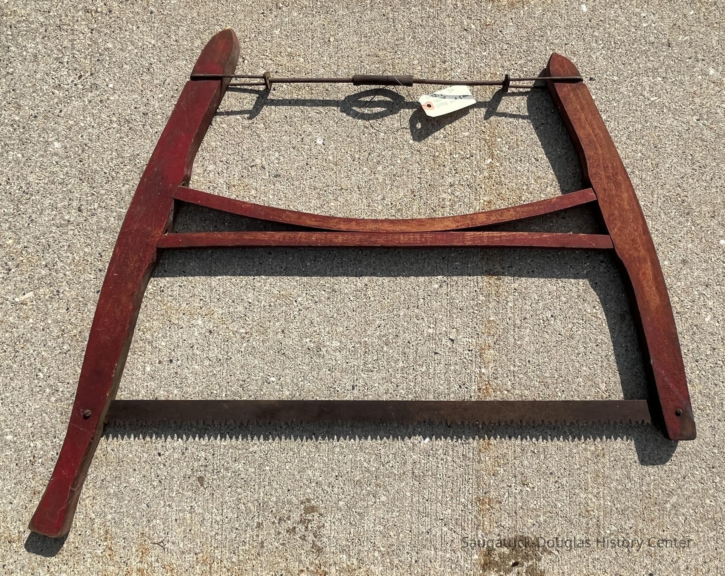 Crosscut saw with a wooden "H"-shaped frame, metal tension adjustment and coarse, teeth blade. Metal blade dimensions are 31" long by 1.25 inches side. Blade teeth are in "Champion" style, alternating plain teeth and "M" shaped teeth. Tool is in excellent condition suggesting it has not had a great deal of use.