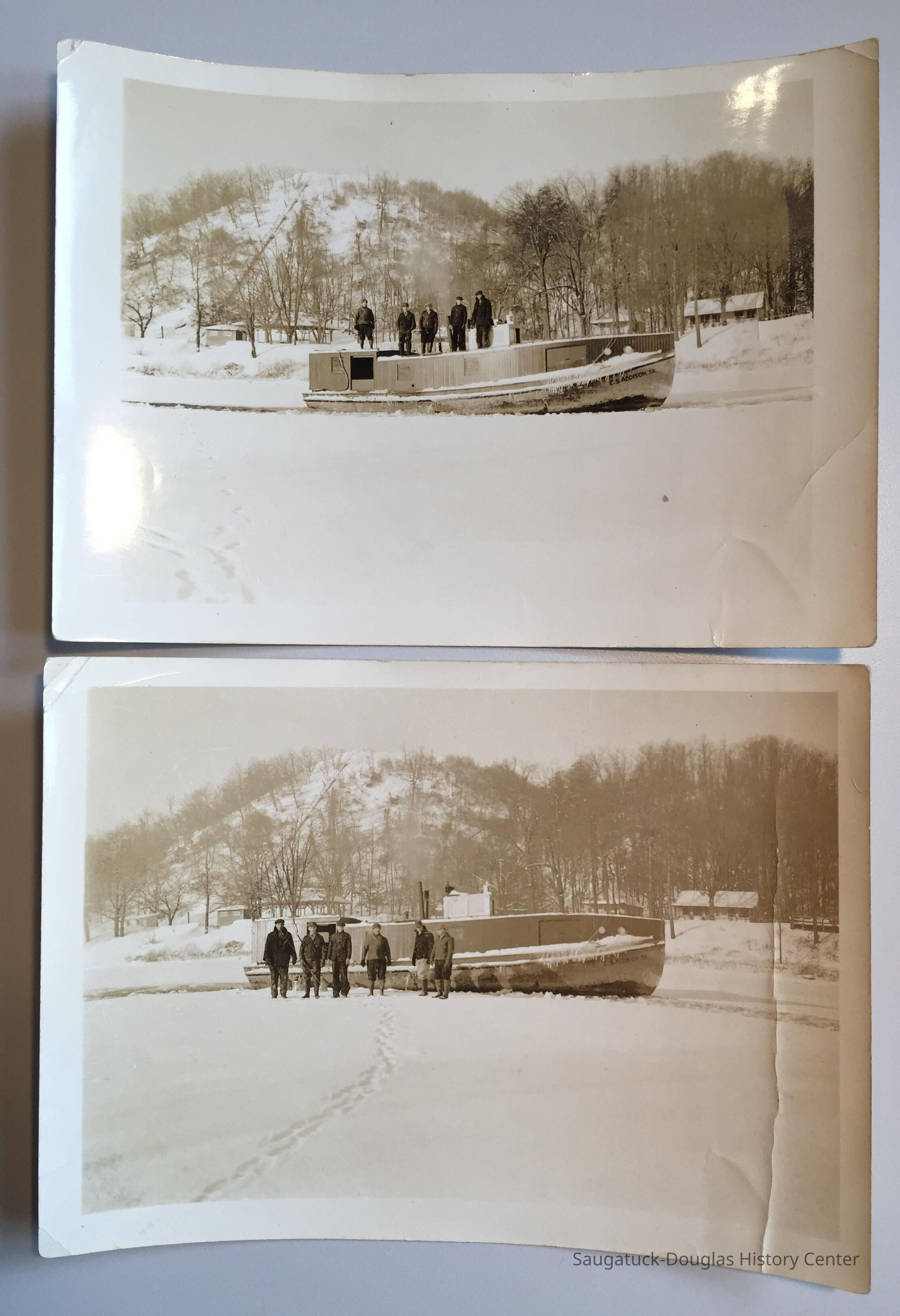 Two b/w photos of the fishing tug C.S. Addison Sr. on the partially frozen Kalamazoo River. The Mt. Baldhead stairs are visible in the background. Men in winter attire are seen standing on the deck or on the ice in front of the tug. Circa 1935-1947