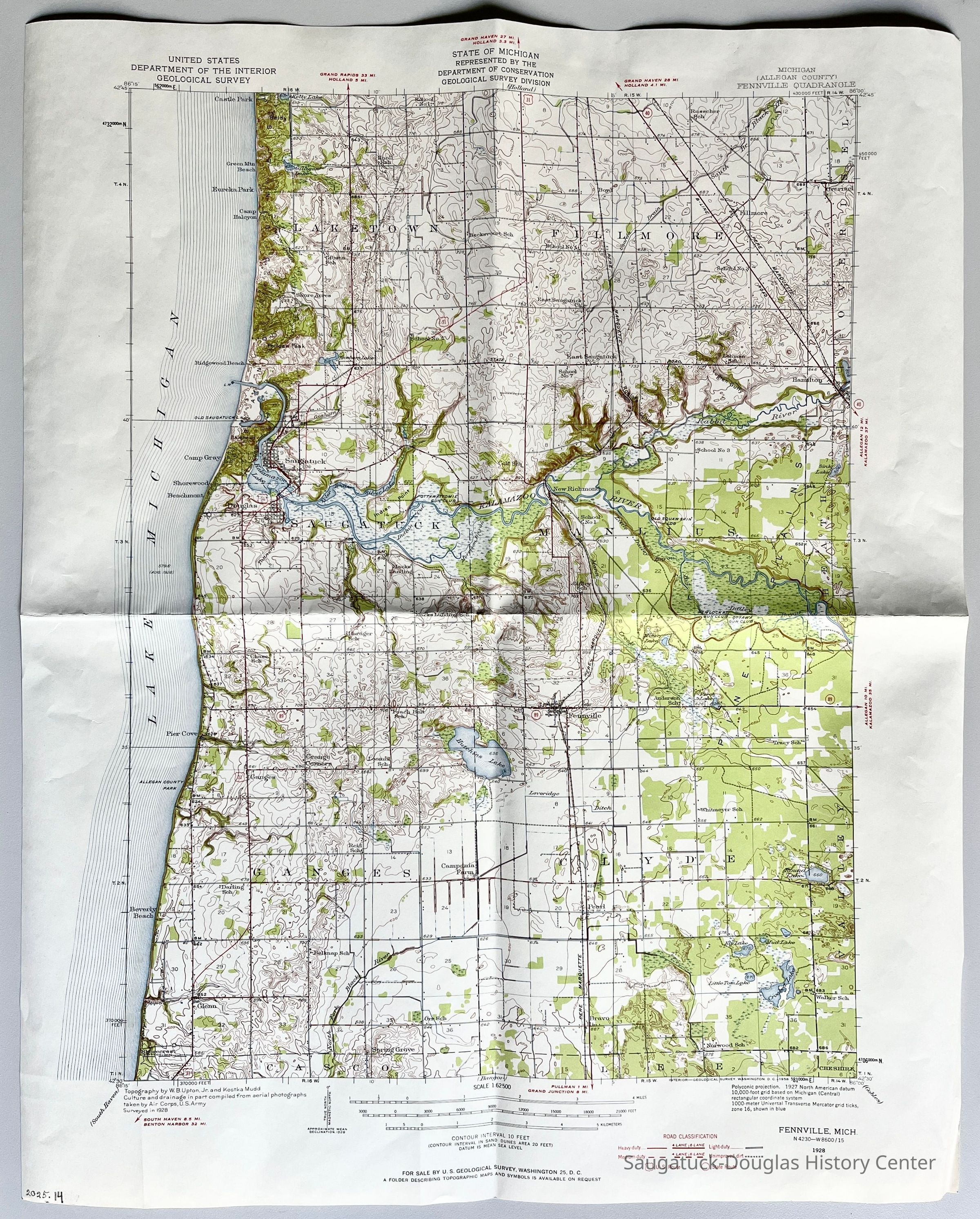 Highly detailed, 5-color USGS quadrangle map of Fennville covering Laketown, Fillmore, Saugatuck, Manlius, Ganges, and Clyde townships. This is the second copy of this map in collection but it is not laminated and was folded. The map is rich in detail, showing buildings, school locations, roads with classification styles, land contours and place names.