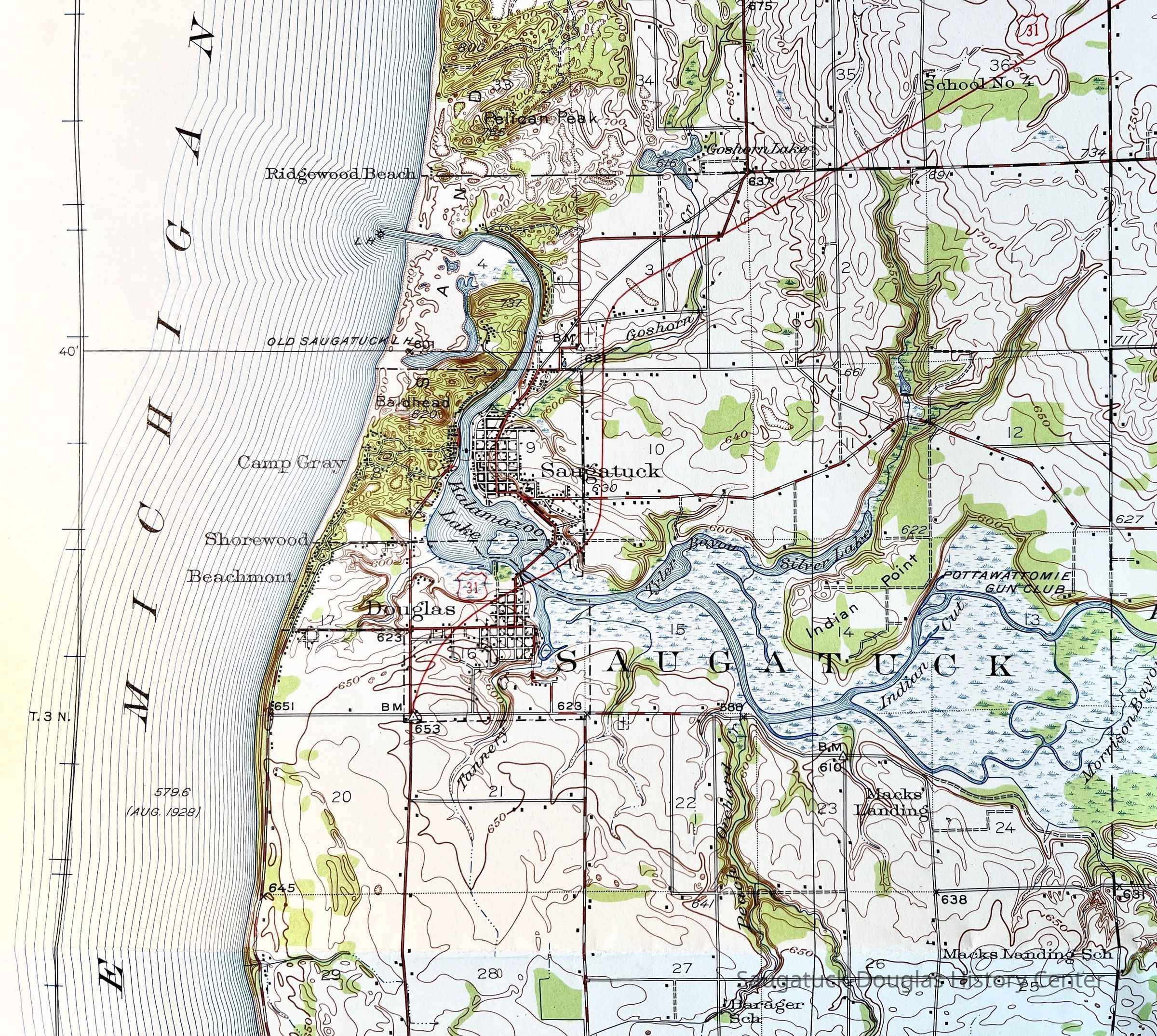 Indicates locations of Gibson School, Carver Drain, Camp Halcyon, Pelican Peak, Shore Acres, School No. 4, East Saugatuck, Ridgewood Beach, Old Saugatuck Harbor and new channel mouth, Camp Gray, Shorewood, Beachmont, US 31, Tannery Creek, Chase School, Barager School, Pier cove, Beach Beld School, Loomis School, Macks Landing Schook. Mack Landing Peach Orchard Creek, Indian Cut, Indian Point, Morrison Bayou, New Richmond, Pottawattomie Gun Club, Colf School, Silver Lake, Tyler Bayou, Rabbit River, Old Squaw Skin, Pere Marquette railroad, Little Dailey Bayou, Campania Farm, and more.