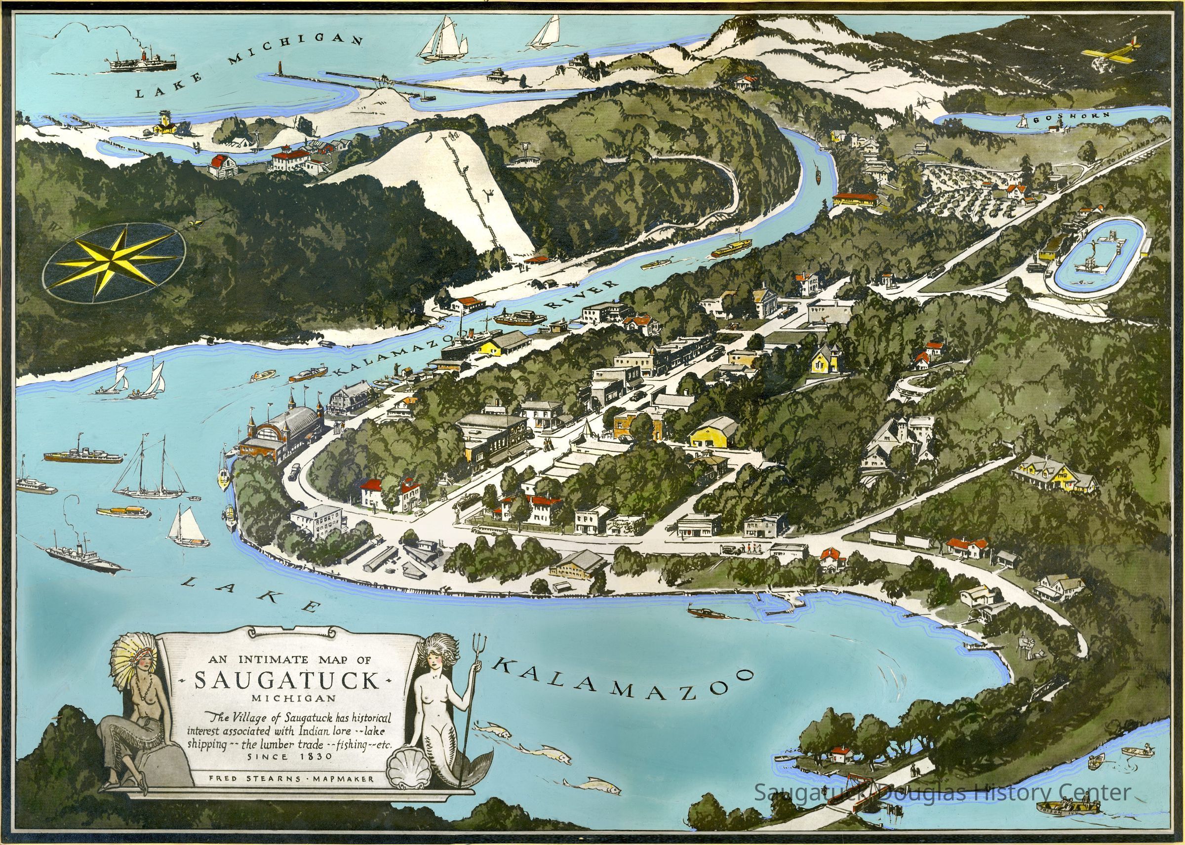 An Intimate Map of Saugatuck Michigan by Fred Stearns circa 1930 Fred Stearns was a student at the Art Institute of Chicago and first visited Saugatuck in 1907. He was art director of Burleigh, Withers, McCallum, Stearns and Jipson Co., a Chicago advertising firm that specialized in work for the auto industry. This map shows places that were important to Stearns — including the Ox-Bow School and a little boat at the lower right named Poison Ivy. Stearns wrote in the Chicago Tribune that “everybody who works amid the tumult of a big city will understand why Saugatuck, Mich. is my favorite town.”