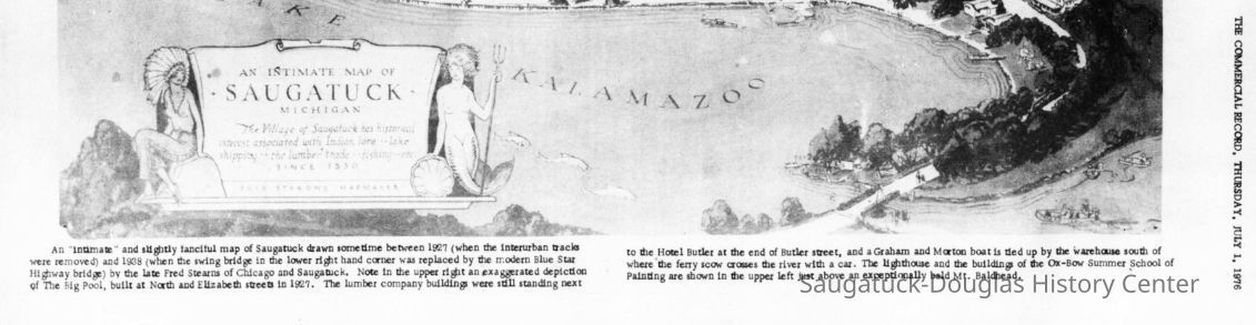 A black and white version of the birds-eye view of Saugatuck designed by Fred Stearns. Map is mounted on cardboard. Map has a decorative title box in the lower left corner adorned with a stereotypical "Indian maid" and mermaid. The map shows both old and new channels, boats on the lake and river, the swing bridge, a very bare Mt. Baldhead with people leaping down the slope, Ox-Bow, Goshorn lake, orchards, the Big Pool, the Big Pavilion, the lumberyard and buildings on Butler Street and many other charming details.