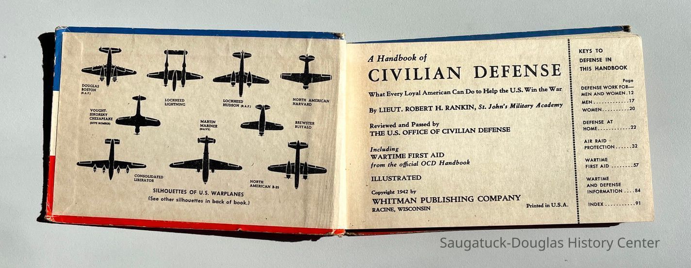 Hardbound pocket guide covering defense work for men and women, defense at home, air raid protection, first aid, wartime information and index. 94 pages with silhouettes of warplanes on the end papers. Reviewed by the U.S. Office of Civilian Defense,