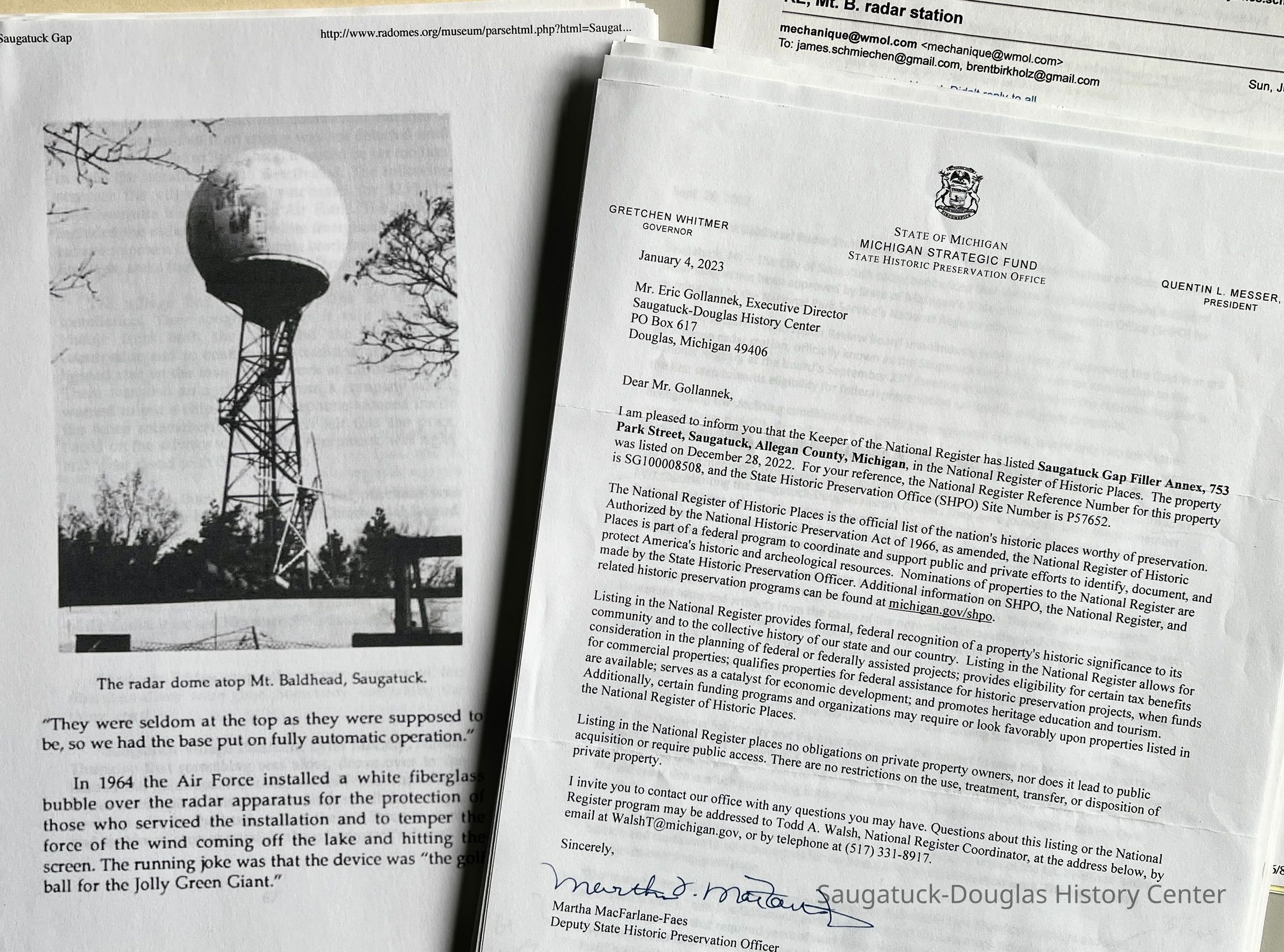 Documents pertaining to the successful 2022 addition of the Saugatuck Gap Filler Annex to the National Registry of Historic Places. Including James Schmiechen's notes from a 2016 Tuesday Talk about the radar station CD with SHPO suggestions to improve the nomination paperwork. 2023 letter from Michigan State Historic Preservation Officer confirming the addition. Draft nominations, preliminary questionnaire, notes, emails The Battle of Saugatuck Gap Cleanup Planning Analysis by ECT Environmental Consulting & Technology, Inc., 2014 Structural Analysis by Alan E. Kolba, 1997 Conceptual master plan for Mt. Baldhead Park, undated Print outs from www.radomes.org