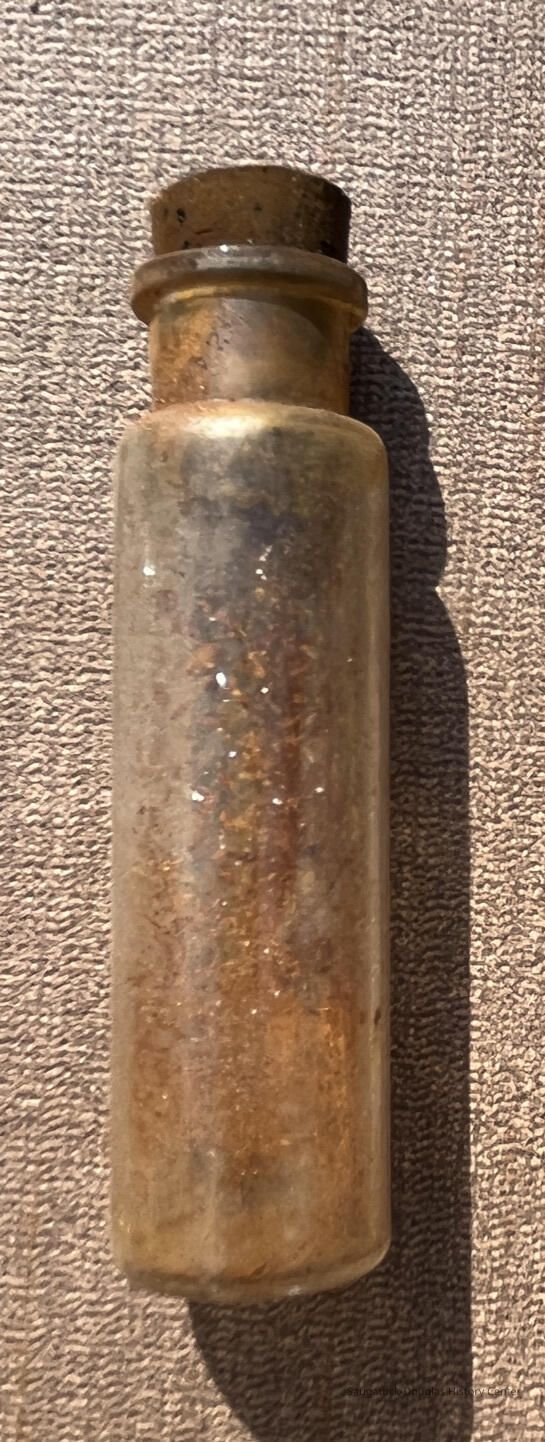 A pair of lockable, brown leather saddle bags with connecting band, edges tooled in a serpentine pattern and the flaps embossed "ELLIOT'S PATENT / GRANTED JAN. 18, 1870 / A.A. MELLIER / ST. LOUIS, MO. / SOLE PROPRIETOR" in an oval. Each bag is divided into a metal-lined upper section (that is empty) and a drawer-like lower section loaded with either 56 small vials or 16 large vials. The vials are corked, some are labels, some are not. Some have material inside, some appear to be empty. The leather is very worn, dusty and torn/rotting in some places. Narrower side strap is broken. Each bag is about 10 inches wide by 8.5 inches tall by 3.5 inches deep. The strap that connects the bag is 22 inches long and 6 inches wide in its narrowest place. The small vials are 4 inches high, including stopper and .5 inch wide. The large vials are 4 inches high and 1 inch wide.