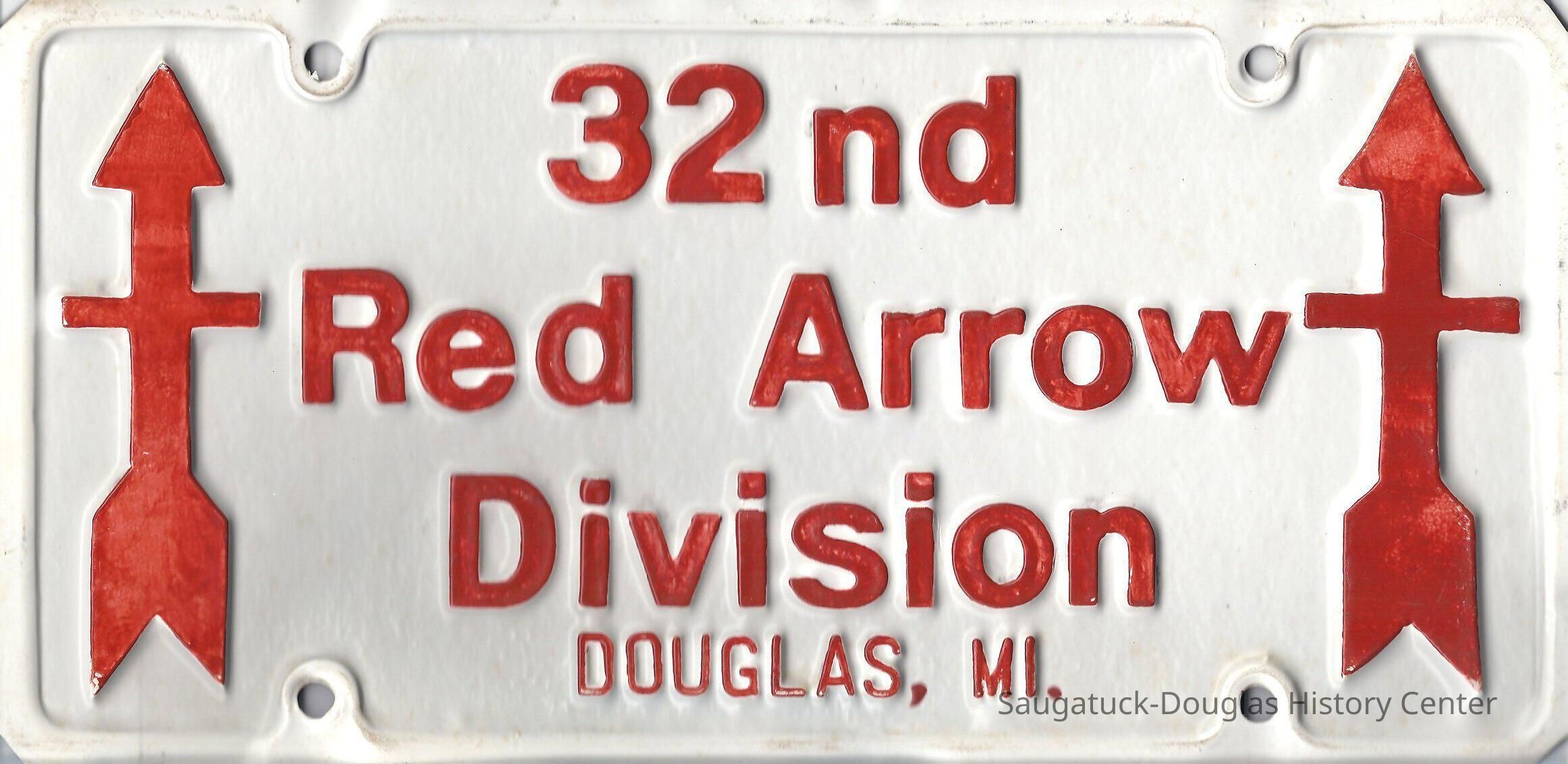 Red and White license plate commemorating the 32nd Red Arrow Division from Douglas, MI