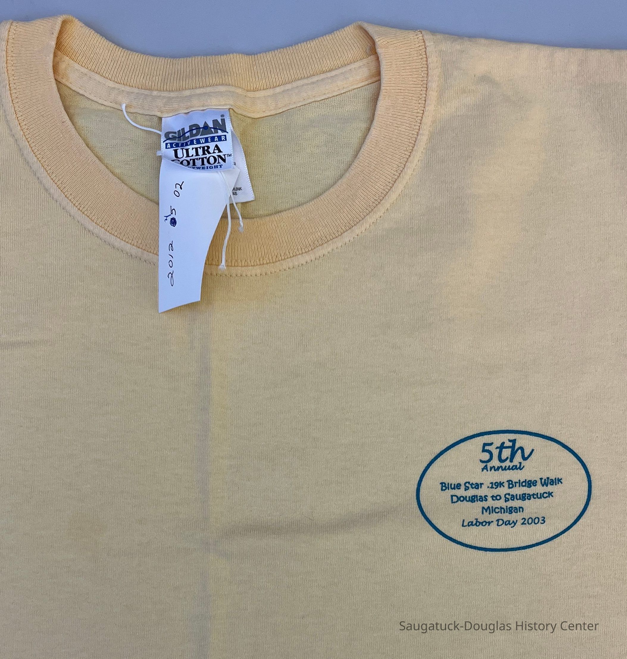 Yellow T-shirt with a small green oval - 5th Annual Blue Star .19 k Bridge Walk Douglas to Saugatuck Michigan Labor Day 2003
