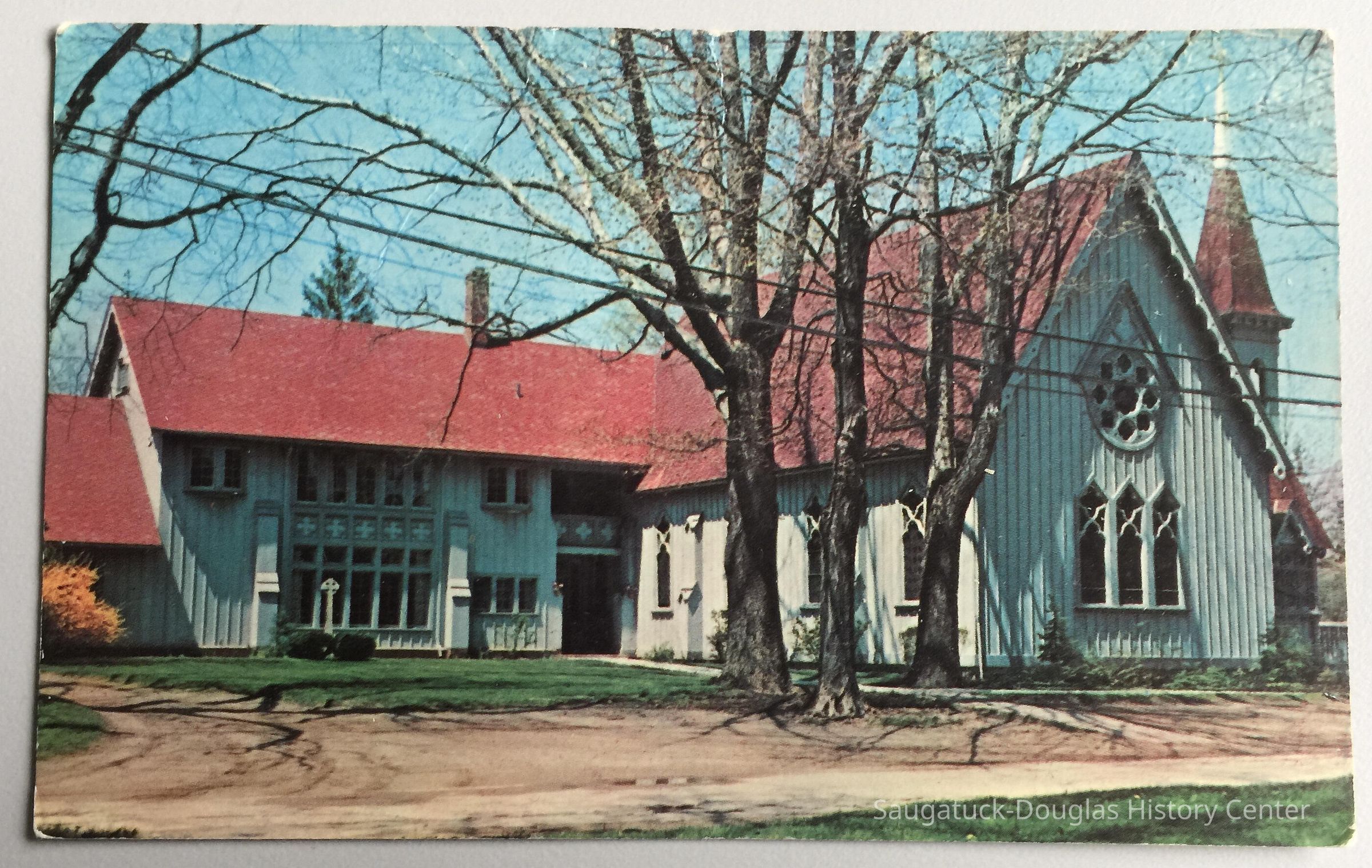 Unposted postcard with the text "All Saints' Episcopal Church, Saugatuck, Michigan A picturesque sanctuary for summer visitors, All Saints' will celebrate its Centennial year in 1968." Card number 12386-C