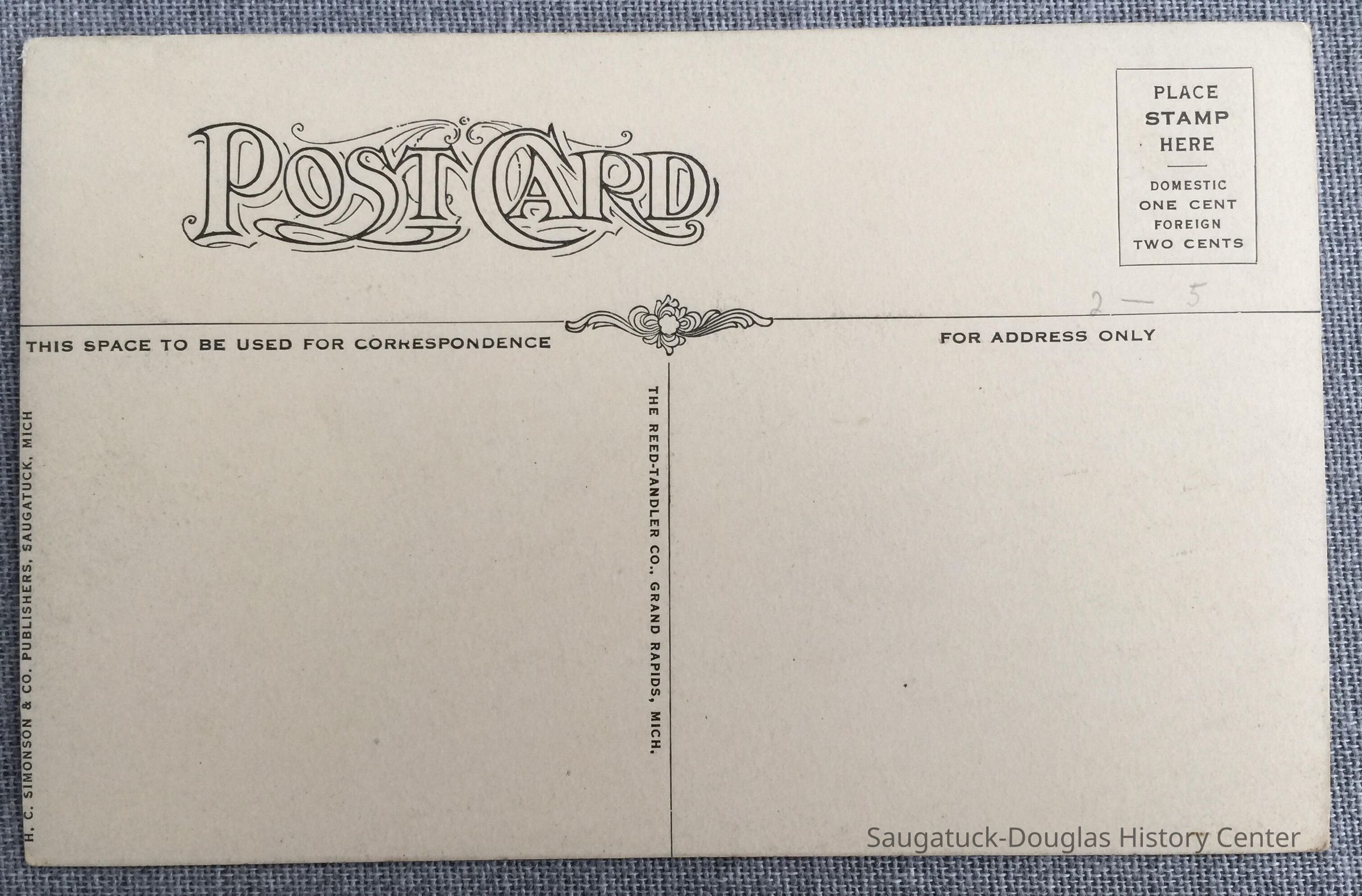 One lone white building, logs and piling, a dock as seen from a boat or the opposite shore. Reflections of the scene fill the bottom half of the front image. Unmailed, no writing. Black ink only on front and back. "Place stamp here" zone lists domestic postage as one cent.