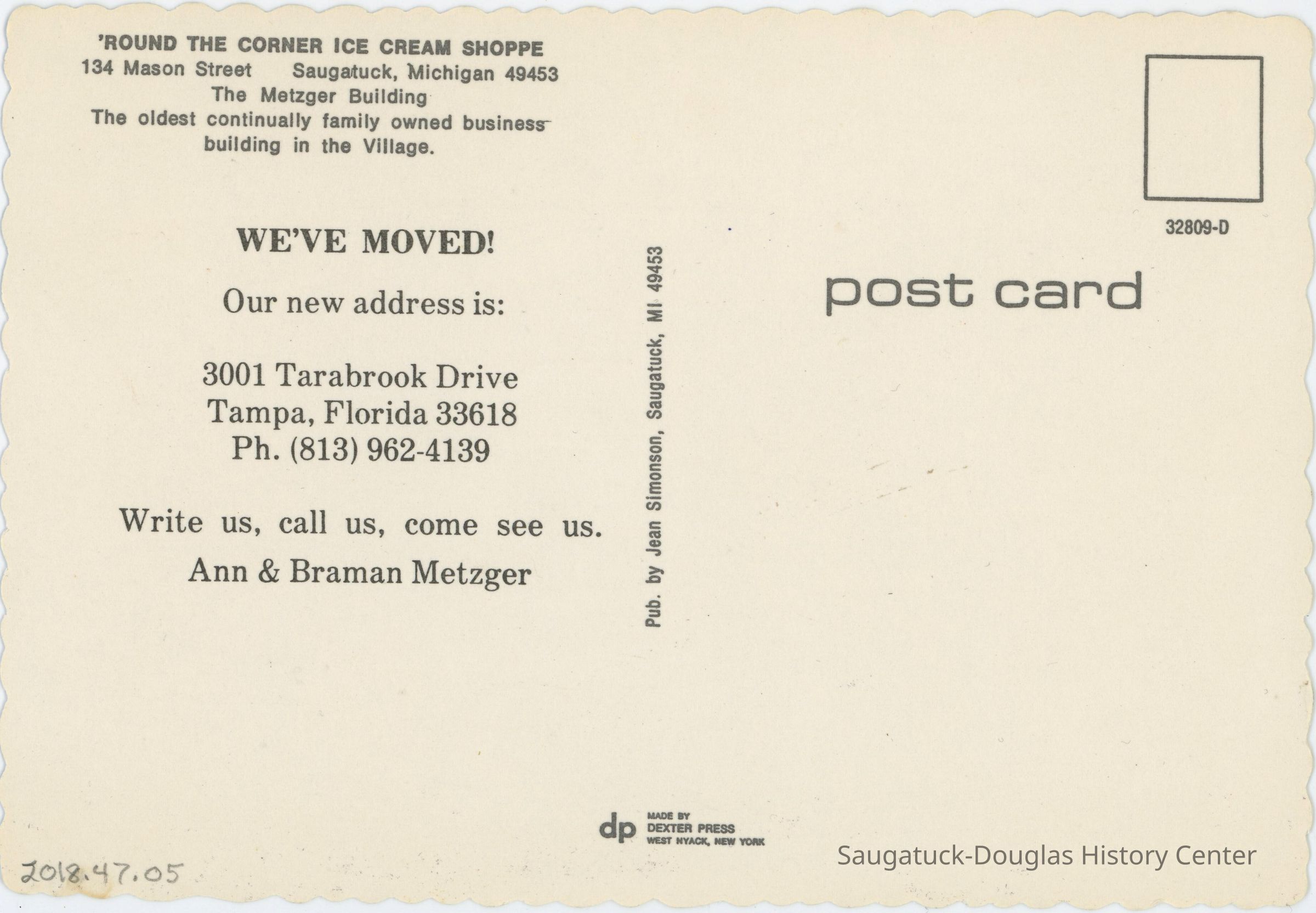 'Round the Corner Ice Cream Shoppe 134 Mason St, Saugatuck, Michigan 49453 The Metzger Building The oldest continually family owned business building in the Village.