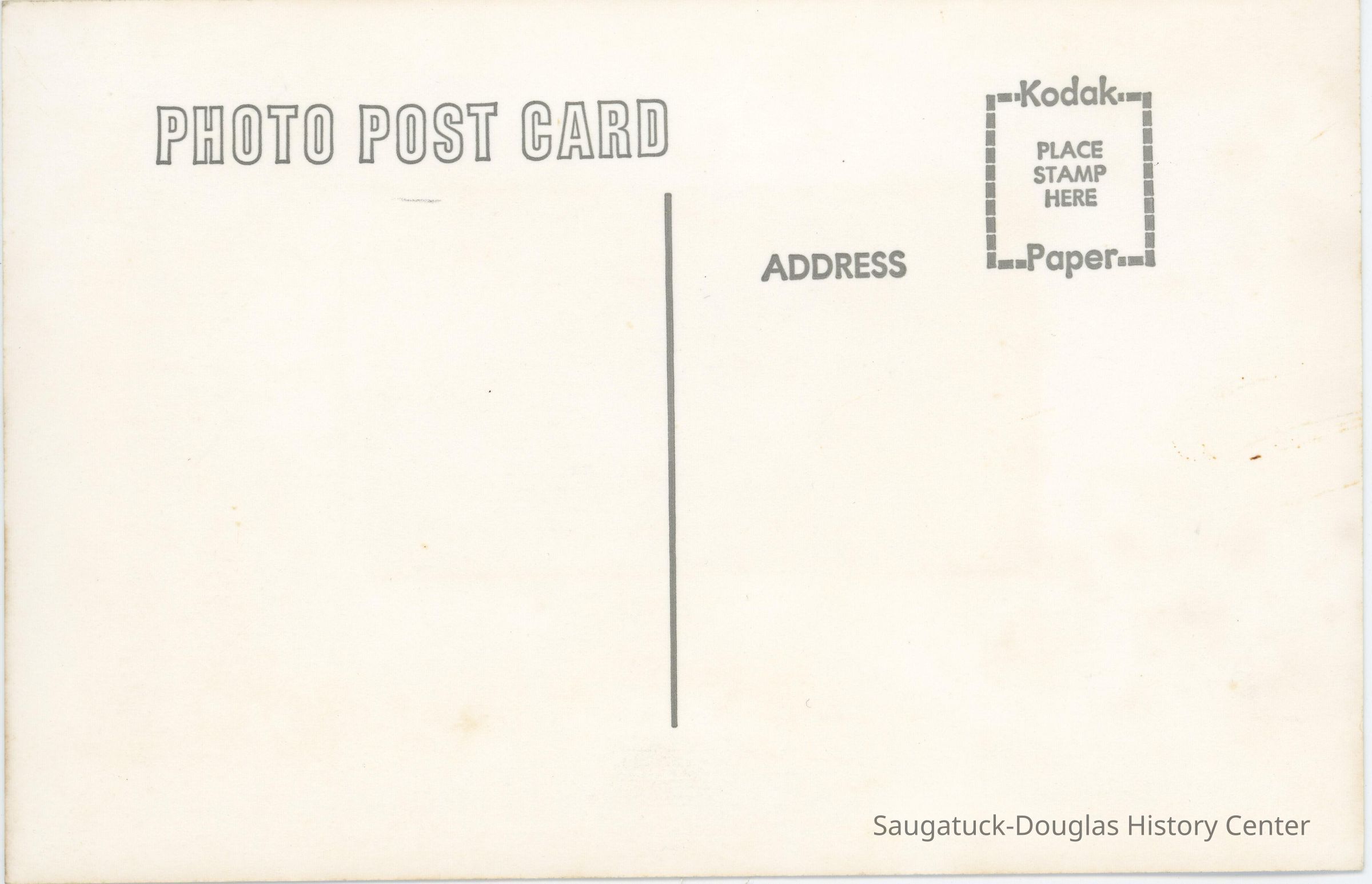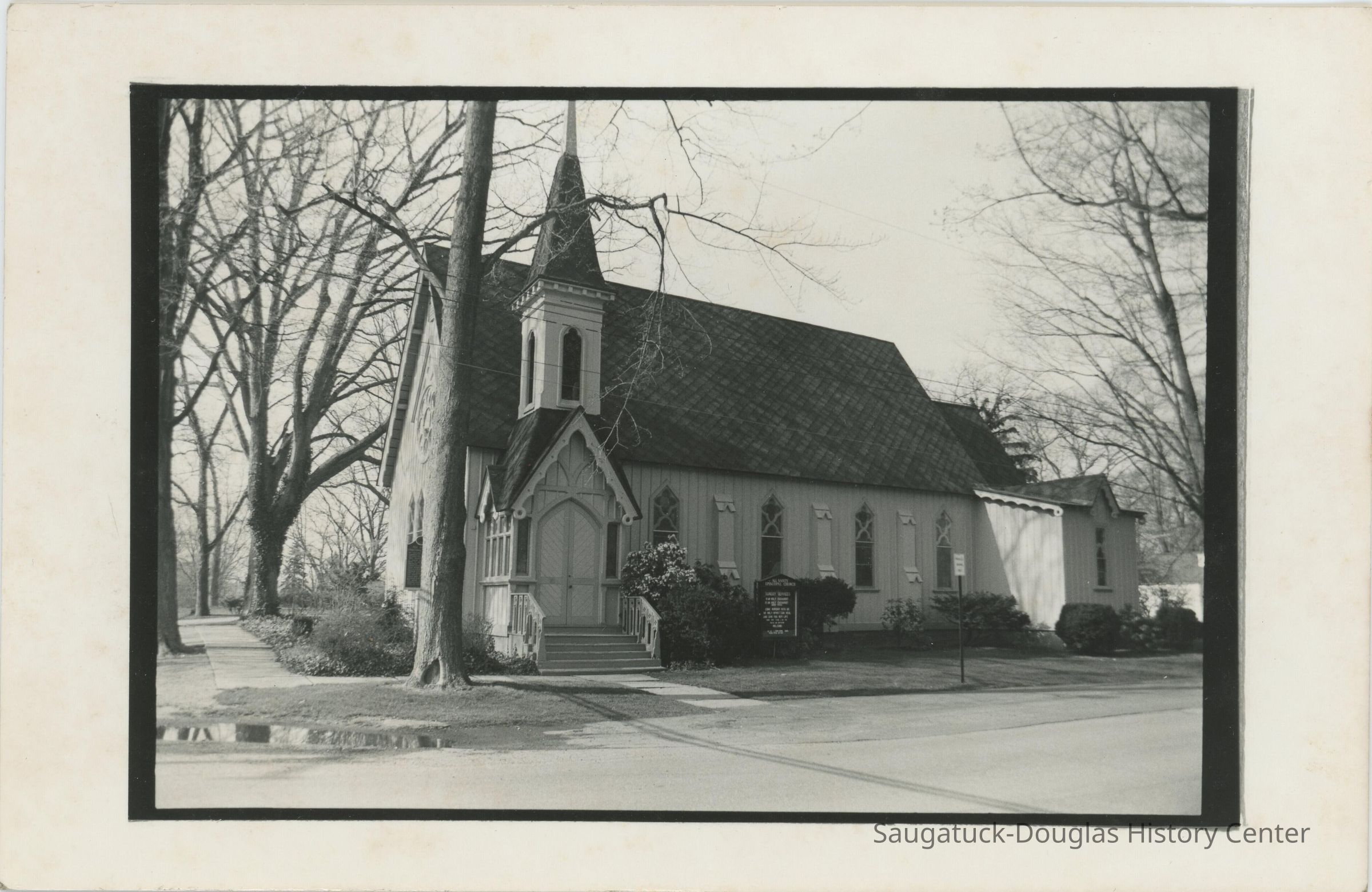A black and white postcard showing the All Saints Episcopal Church from the corner of the road during the winter or early spring. A steeply sloped roof characterizes the nave.