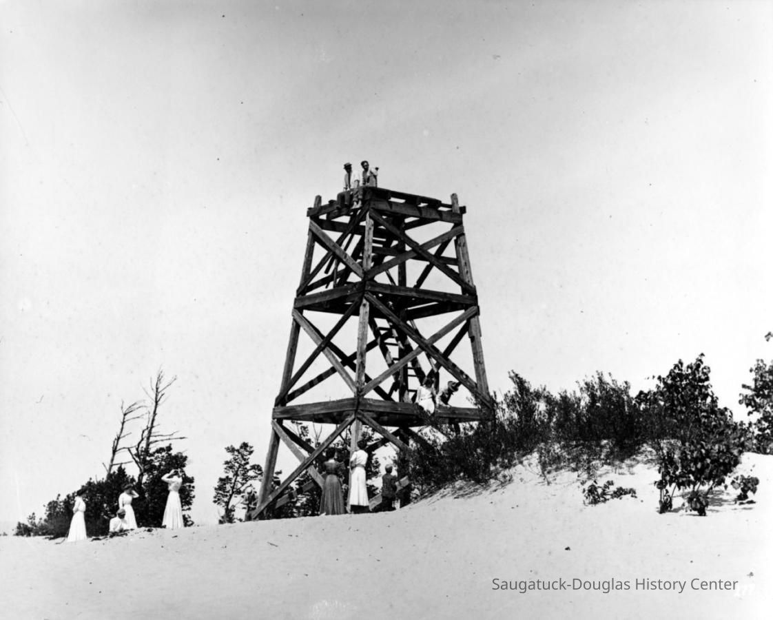 Women in long dresses enjoy the views from atop Mt. Baldhead and the wooden observation tower. The blue sky is pink near the horizon. Code R-19152 at upper top and note that card is "Made in U.S.A." Unmailed, no writing. Color image on front and green-ink only on back. "Place stamp here" zone lists domestic postage as one cent. Image is printed, not a photo.