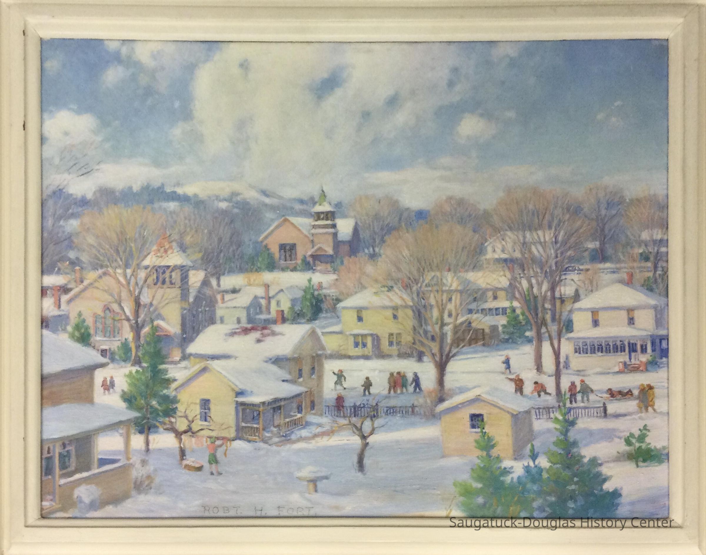 Oil painting titled "Children Coming Home from School" by Robert Harry Fort. The scene is of Saugatuck Michigan in the snow showing the Methodist and Congregational Churches and surrounding houses. It also shows children at play and a woman hanging laundry on a line.