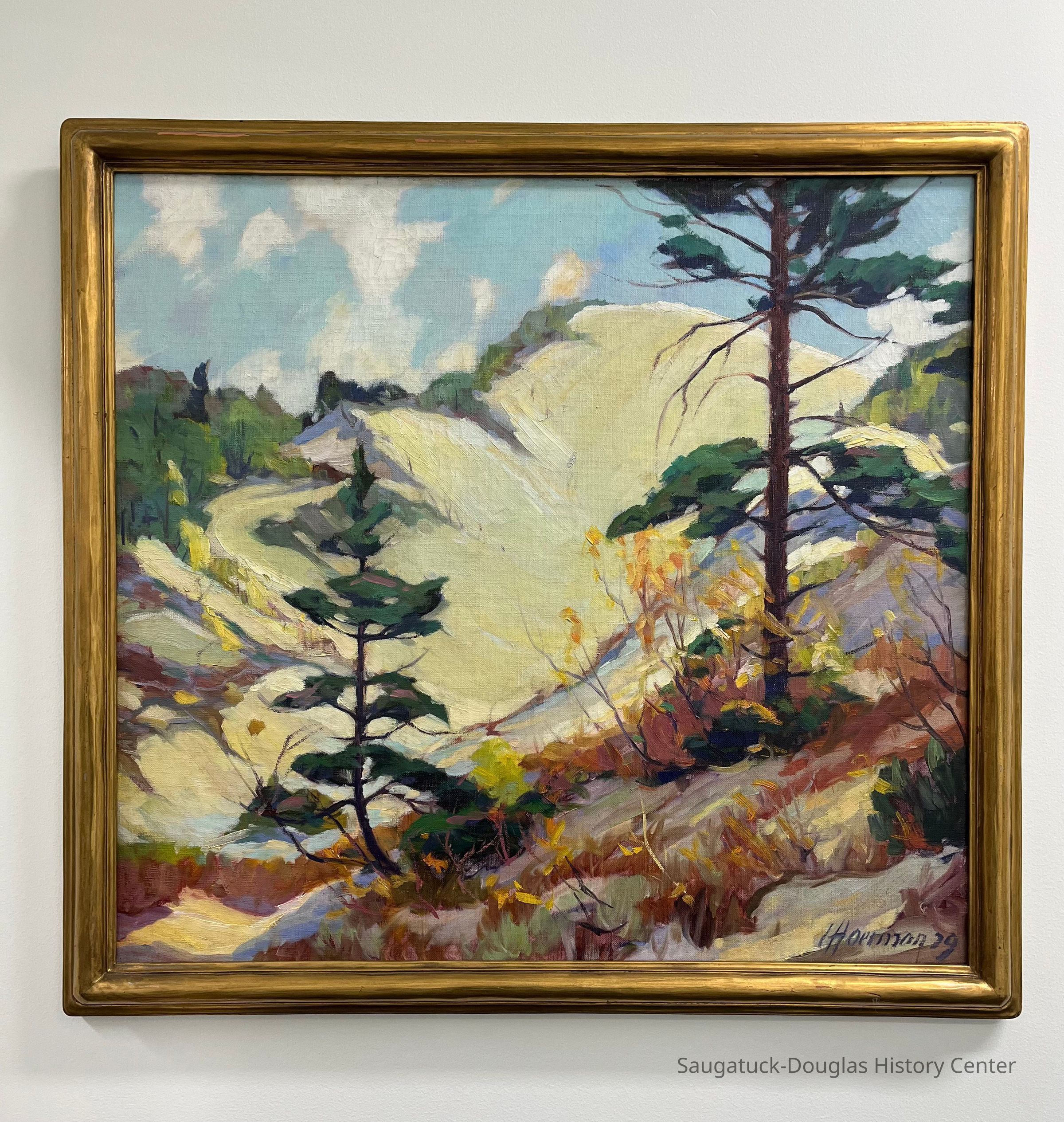 This painting hung in the Saugatuck Fruit Growers bank (and it many later iterations) for more than 90 years. According to an article in the November 8, 1929 Commercial Record newspaper, the work was painted "near the end of the Skylin Drive on the Felt estate with the glistening dune near Gibson rising to the North. One of the picturesque old pines nearby is introduced in the foreground with its somber green contrast to the vivid coloration of advanced autumn." The landscape captured by Hoerman still exists today in the Saugatuck Dunes State Park and the Shore Acres Township Park in Laketown Township.