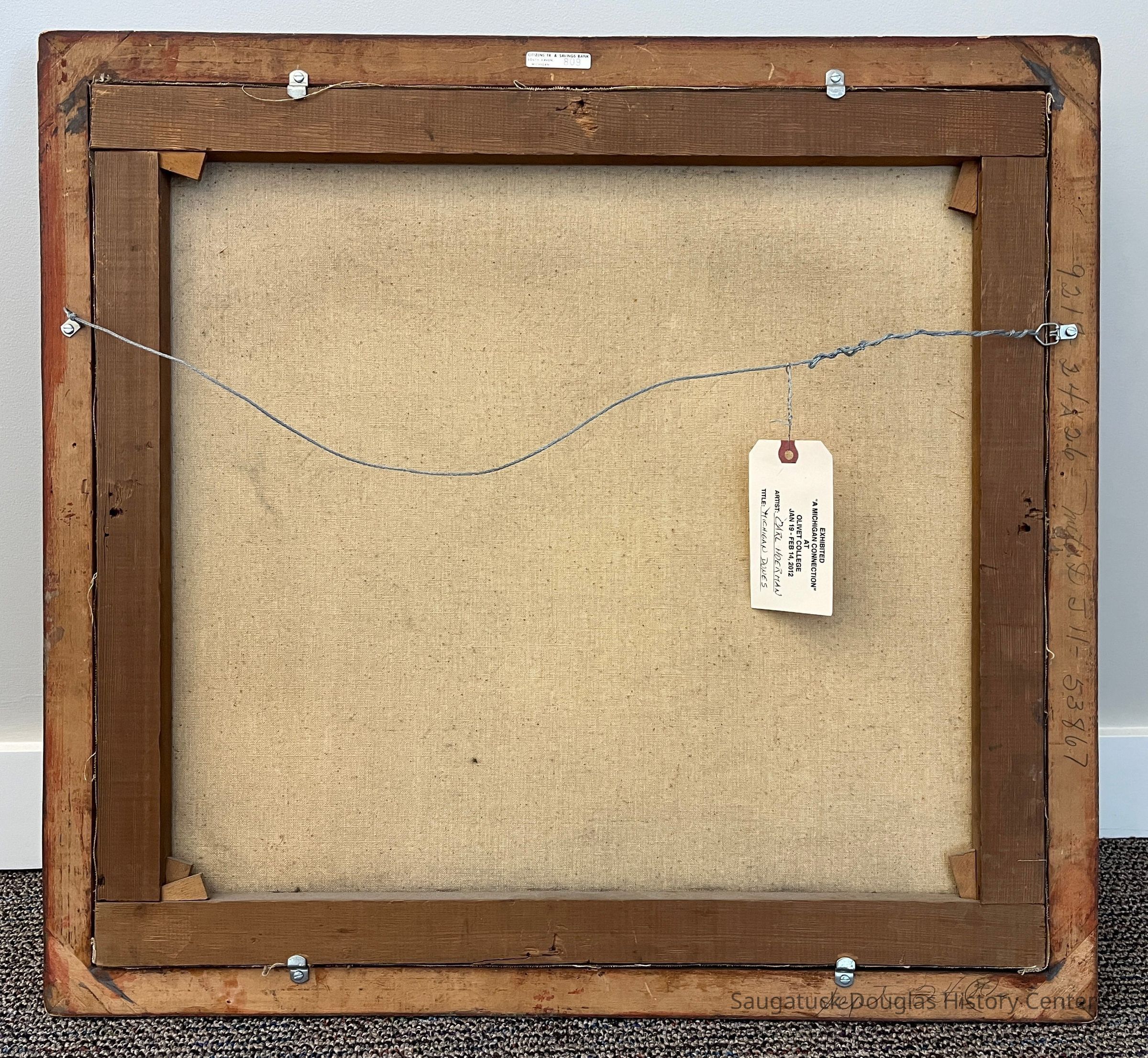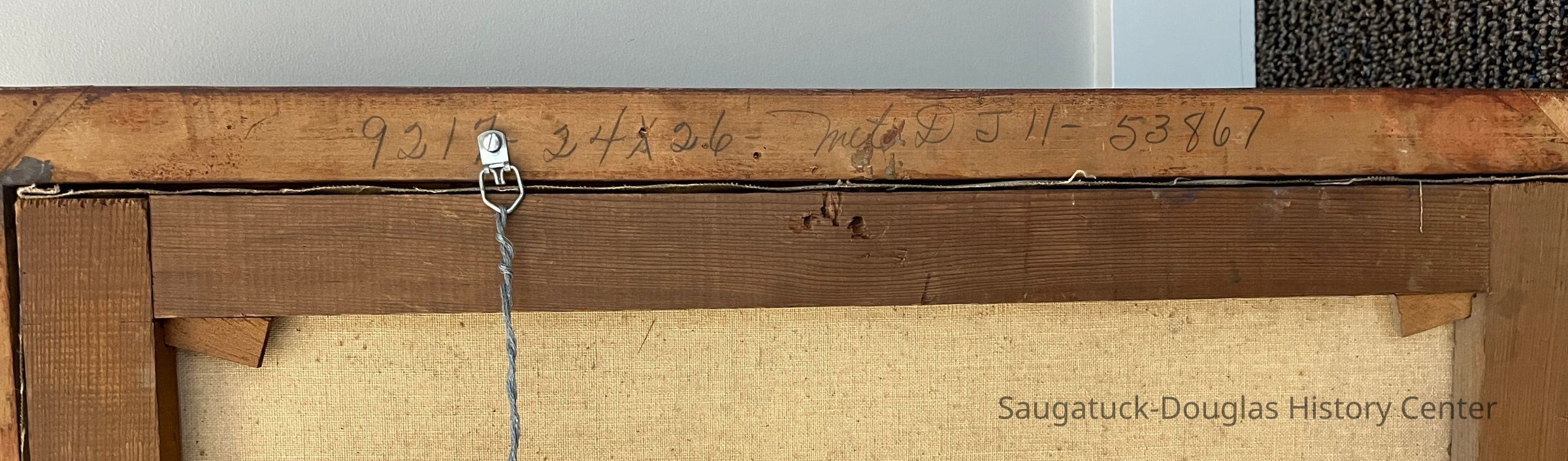 The painting appears on page 24 of the 1997 SDHC publication "Painting the Town" as "Big Pavilion from the Douglas Shore," 1949, with the following description on page 33: "In Michigan and Chicago he [Hoerman] is best known for his landscapes and dune scenes, with dramatic foliage outlined against a sky of swirling clouds. In a large painting of Kalamazoo Lake the viewer looks over the south bank of the lake, past fall-tinted foliage to the village of Saugatuck on the north bank where the Big Pavilion looks pink in the brightness of a morning sun. The sandy top of Mount Baldhead gleams in the distance."