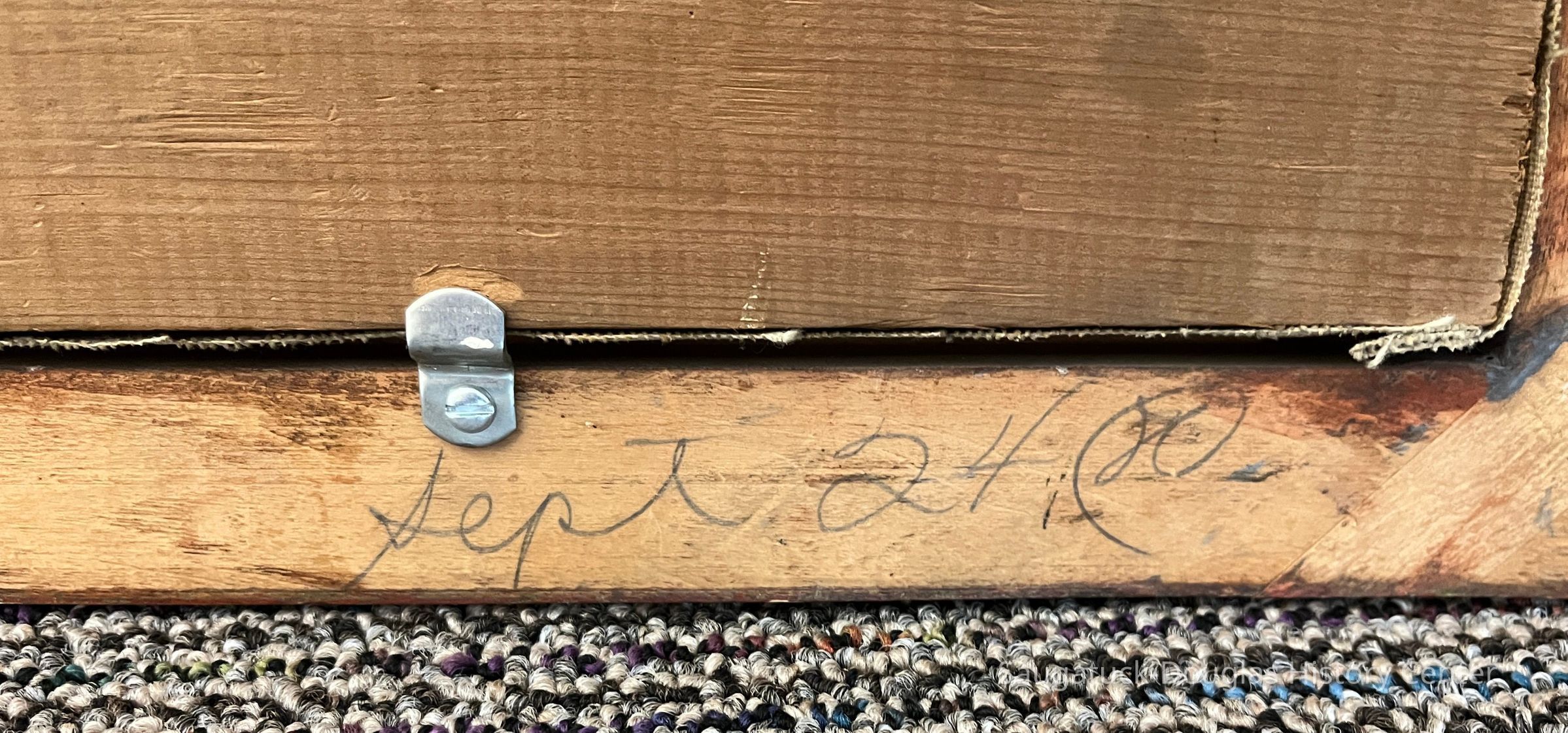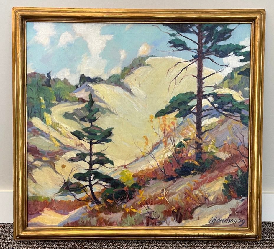 Carl Hoerman 1885-1955 Autumn Symphony 1929 | oil on canvas For more than 90 years, this painting by Carl Hoerman delighted lovers of art visiting Saugatuck's Fruit Growers State Bank on Mason Street. A note penciled on the frame - Sept likely indicates the painting was created on September 24, 1929. The landscape captured by Hoerman can be seen today in the Saugatuck Dunes State Park and the Shore Acres Township Park in Laketown Township. SDHC Collection Gift of Huntington Bank Accession number 2023.03.02
