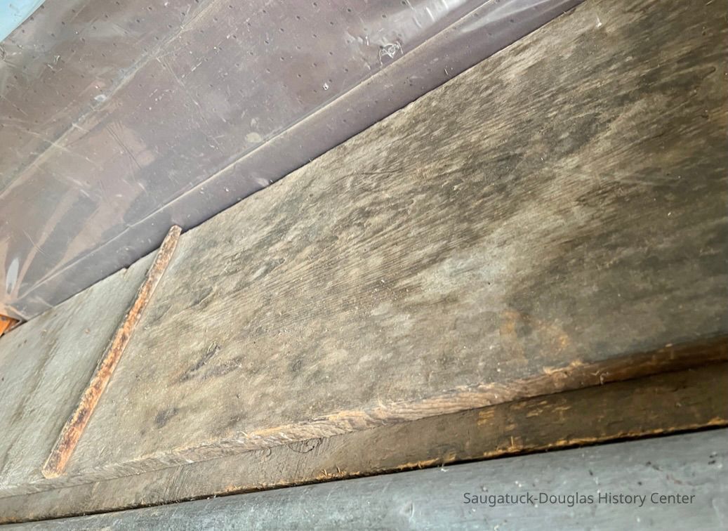 Boards were from a house moved from Singapore to Holland and North Street in Saugatuck. The house was owned by Henry Gleason and was demolished in the mid 2010s, according to Linus Starring. These boards may have been produced locally when large pine trees were available.