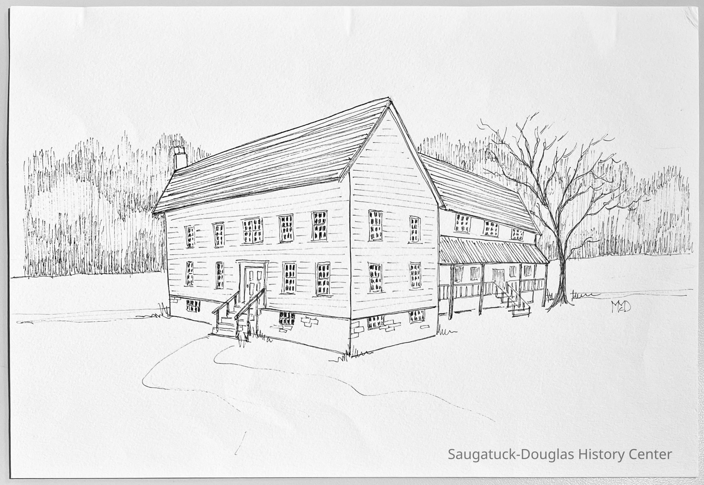 Ink drawing on watercolor paper of a large, multiple-story building that once existed in Singapore, Michigan. Drawn by Margaret McDermott based on a description by Laura Hudson Hutchins interpreted by architectural historian Dr. James Schmiechen. The drawing appeared in SDHS publication "Raising the Roof" 2nd edition page 13 and "Remembering When" newspaper articles [see 2021.87.114].